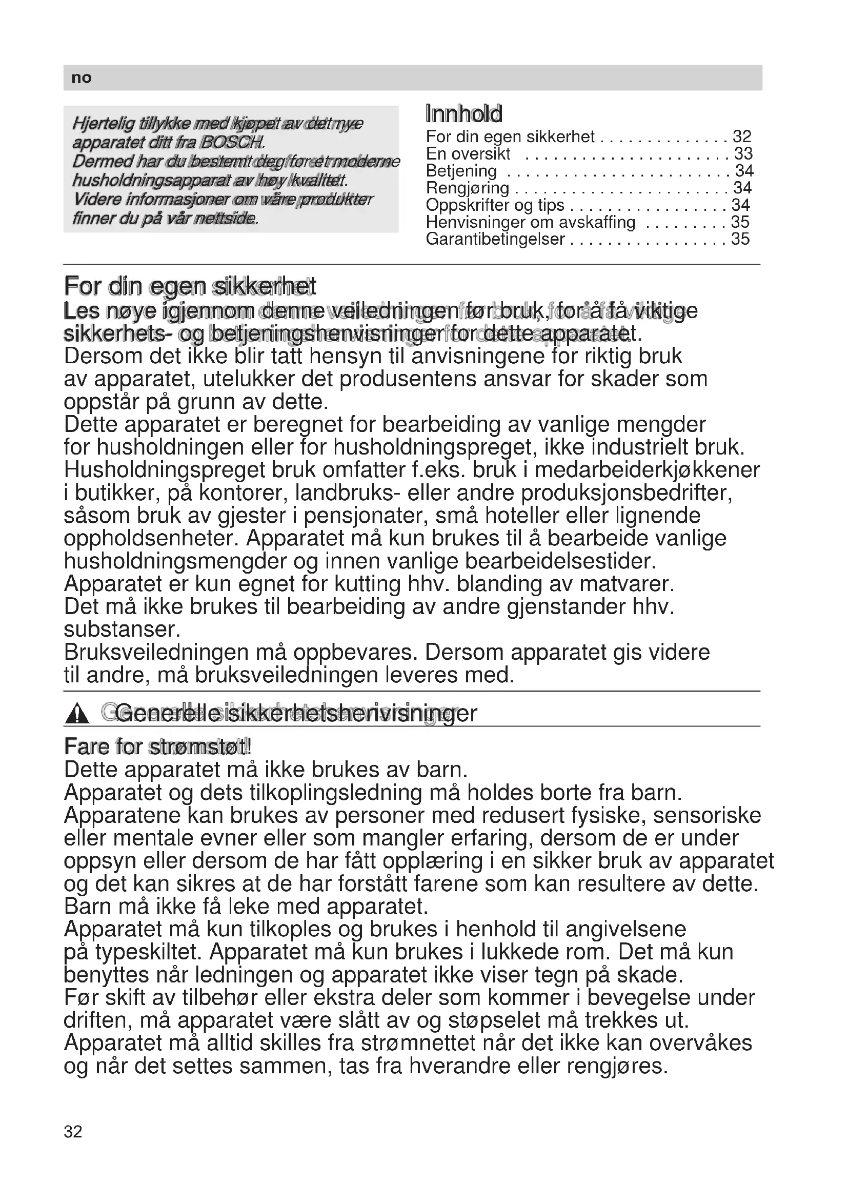 - Garantibetingelser For din egen sikkerhet Les nøye igjennom denne veiledningen før bruk, for å få viktige sikkerhets- og betjeningshenvisninger for dette apparatet. Dersom det ikke blir tatt hensyn til anvisningene for riktig bruk av apparatet, utelukker det produsentens ansvar for skader som oppstår på grunn av dette. Dette apparatet er beregnet for bearbeiding av vanlige mengder for husholdningen eller for husholdningspreget, ikke industrielt bruk. Husholdningspreget bruk omfatter f.eks. bruk i medarbeiderkjøkkener i butikker, på kontorer, landbruks- eller andre produksjonsbedrifter, såsom bruk av gjester i pensjonater, små hoteller eller lignende oppholdsenheter. Apparatet må kun brukes til å bearbeide vanlige husholdningsmengder og innen vanlige bearbeidelsestider. Apparatet er kun egnet for kutting hhv. blanding av matvarer. Det må ikke brukes til bearbeiding av andre gjenstander hhv. substanser. Bruksveiledningen må oppbevares. Dersom apparatet gis videre til andre, må bruksveiledningen leveres med. , Generelle sikkerhetshenvisninger Fare for strømstøt! Dette apparatet må ikke brukes av barn. Apparatet og dets tilkoplingsledning må holdes borte fra barn. Apparatene kan brukes av personer med redusert fysiske, sensoriske eller mentale evner eller som mangler erfaring, dersom de er under oppsyn eller dersom de har fått opplæring i en sikker bruk av apparatet og det kan sikres at de har forstått farene som kan resultere av dette. Barn må ikke få leke med apparatet. Apparatet må kun tilkoples og brukes i henhold til angivelsene på typeskiltet. Apparatet må kun brukes i lukkede rom. Det må kun benyttes når ledningen og apparatet ikke viser tegn på skade. Før skift av tilbehør eller ekstra deler som kommer i bevegelse under driften, må apparatet være slått av og støpselet må trekkes ut. Apparatet må alltid skilles fra strømnettet når det ikke kan overvåkes og når det settes sammen, tas fra hverandre eller rengjøres. p. 35
