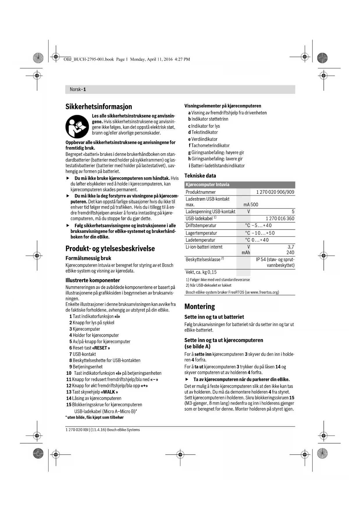 - uten bilde, fås kjøpt som tilbehør Visningselementer på kjørecomputeren a Visning av fremdriftshjelp fra drivenheten b Indikator støttetrinn c Indikator for lys d Tekstindikator e Verdiindikator f Tachometerindikator g Giringsanbefaling: høyere gir h Giringsanbefaling: lavere gir i Batteri-ladetilstandsindikator Tekniske data Montering Sette inn og ta ut batteriet Følg bruksanvisningen for batteriet når du setter inn og tar ut eBike-batteriet. Sette inn og ta ut kjørecomputeren (se bilde A) For å sette inn kjørecomputeren 3 skyver du den inn i holde- ren 4 forfra. For å ta ut kjørecomputeren 3 trykker du på låsen 14 og skyver computeren ut av holderen 4 forfra. Ta av kjørecomputeren når du parkerer din eBike. Det er mulig å feste kjørecomputeren slik at den ikke kan tas ut av holderen. Du må da demontere holderen 4 fra styret. Sett kjørecomputeren i holderen. Skru blokkeringsskruen 15 (M3-gjenger, 8 mm lang) nedenfra og inn i holderens gjenger som er beregnet for denne. Monter holderen på styret igjen. Kjørecomputer Intuvia Produktnummer 1 270 020 906/909 Ladestrøm USB-kontakt max. mA 500 Ladespenning USB-kontakt
