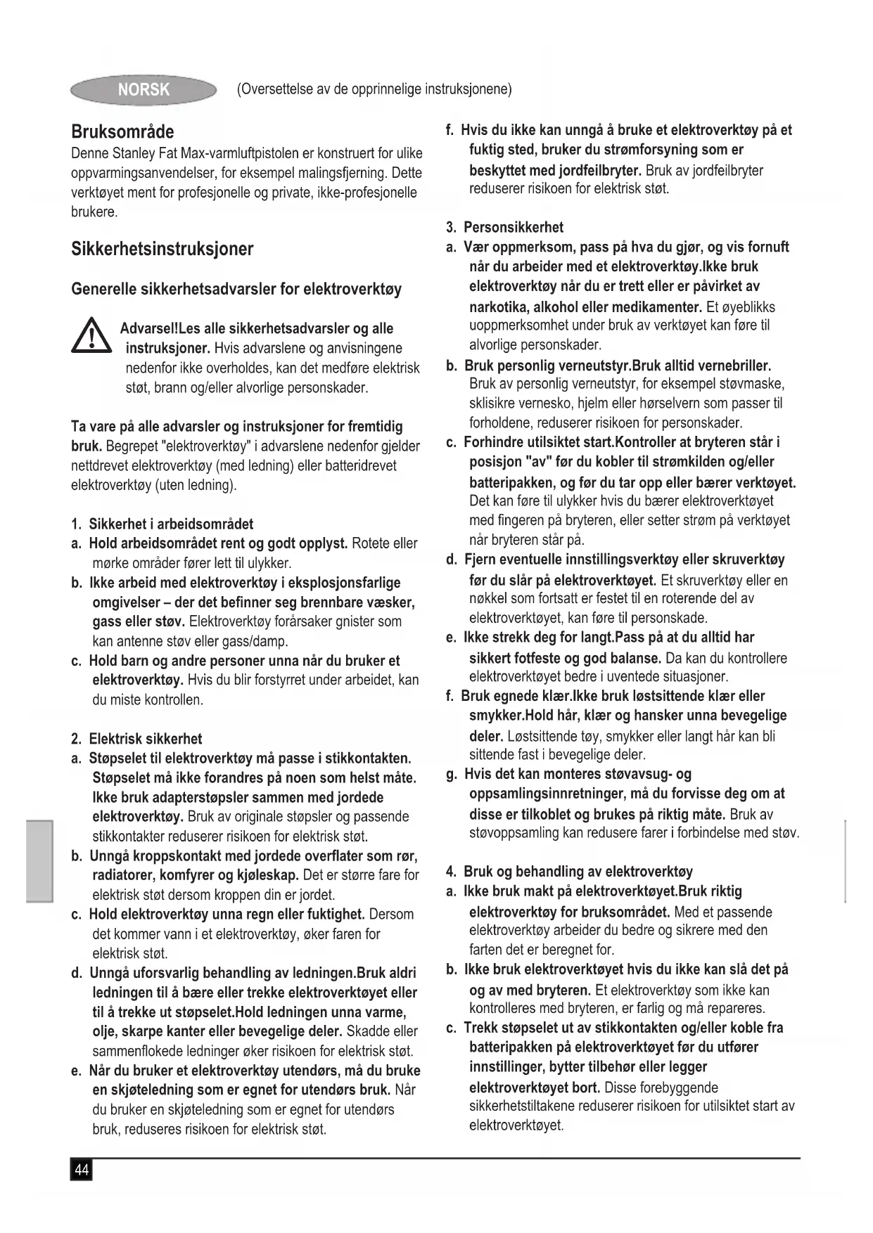 Montering Advarsel! Før monteringen må du passe på at verktøyet er slått av, og at kontakten er trukket ut. Sette på et tilbehør (g. C, D, E & F) Du kan skaffe et utvalg av tilbehør hos din lokale forhandler. w Konisk munnstykke (5): Konsentrerer luftstrømmen på et mindre område. w Fiskehale (6): Sprer luftstrømmen over et større område. w Skjereektor (7): For lodding av rør. w Glassbeskytter (8): For beskyttelse av glass under fjerning av maling. w Skrape (9&10): For fjerning og stripping av maling og lakk. u Fest koblingsstykket til tilbehøret over munnstykket (2). Bruk Stille inn temperaturen (gur A) u Når du skal øke temperaturen, dreier du varmekontrol- lknotten (2) med klokken. u Når du skal redusere temperaturen, dreier du varmekon- trollknotten mot klokken. Slå på og av u Når du skal slå verktøyet på med lav lufthastighet og lav varme, setter du av/på-bryteren i stillingen I. u Når du skal slå verktøyet på høy lav lufthastighet og høy varme, setter du av/på-bryteren i stillingen II. u Når du skal slå apparatet av, setter du av/på-bryteren i stillingen O. Bruke verktøyet Av hensyn til din sikkerhet er dette verktøyet utstyrt med termostat.Hvis du bruker verktøyet sammenhengende i lange perioder eller utsetter det for annen tung belastning, kan verk- tøyet bli overopphetet og kan slutte å fungere.Det anbefales derfor å la verktøyet kjølne med regelmessige mellomrom under bruk. u La verktøyet bli varmet opp noen sekunder før bruk. u Først kan det komme noe røyk ut av munnstykket.Dette er normalt og vil snart avta. u Bruk en innstilling for lav temperatur for å tørke maling og lakk, fjerne etiketter, krympe isolasjonsrør og tine frosne rør. u Bruk en innstilling for middels temperatur for å sveise plast, bøye plastrør og løsne mutre og skruer som sitter fast. u Bruk en innstilling for høy temperatur for å fjerne maling og lakk og for å lodde rørforbindelser. u Hvis du er usikker når det gjelder bruk av dette verktøyet på et bestemt materiale, starter du med en lav tem- peraturinnstilling og utfører en test på en skrapbit av materialet. Håndfri bruk (gur B) Verktøyet har stativområder (4) for å lette håndfri bruk. u Plasser verktøyet med munnstykket opp på en overate der det ikke kan velte. u Sikre kabelen for å hindre at den kan trekke verktøyet overende.47 (Oversettelse av de opprinnelige instruksjonene) NORSK Advarsel! Rett alltid verktøyet bort fra deg selv eller andre personer.Ikke berør munnstykket.Pass på at ikke noe materi- ale faller inn i munnstykket. Fjerne maling u Rett den varme luften mot arbeidsområdet for å varme opp malingen. u Ikke brenn malingen.Hold munnstykket minst 25 mm fra overaten. u Når malingen blir myk, fjerner du den med en skarpe. Skrap bort den myke malingen straks, for ellers blir den hard igjen. u Skrap i treets berretning der det er mulig.u Ikke la det samle seg maling og rusk på skrapen.u Når du skraper på et loddrett underlag, skraper du nedo- ver så du hindrer at malingen faller tilbake i munnstykket. u Når du fjerner maling fra en overate ved siden av glass, treffer du nødvendige tiltak for å beskytte glasset mot varmen. Advarsel! Bruk et glassbeskyttelsesmunnstykke når du fjerner maling fra vinduer med metall eller trerammer. u Kast alt malingsavfall på sikker måte, og pass på at arbeidsområdet er gjort grundig rent etter bruk. Nedkjøling Under bruk blir munnstykket på verktøyet svært varmt.Når du har slått det av, må du la verktøyet kjølne i minst 30 minutter. u Plasser verktøyet med munnstykket opp på en overate der det ikke kan velte. u Hvis du vil redusere avkjølingstiden, kjører du verktøyet på laveste temperaturinnstilling noen minutter før du slår apparatet av. Vedlikehold Stanley Fat Max-apparatet er konstruert for å være i drift over lengre tid med et minimum av vedlikehold.Apparatet er avhengig av godt vedlikehold og regelmessig rengjøring for å fungere som det skal til enhver tid. Advarsel! Før du utfører vedlikehold på apparatet, må du slå det av, trekke ut støpselet og la apparatet kjølne. u Rengjør ventilasjonsåpningene i apparatet jevnlig med en myk børste eller tørr klut. u Maskinen rengjøres bare med mild såpe og en fuktig klut. Ikke bruk slipende eller løsemiddelbaserte rengjøringsmi- dler.La det aldri sive væske inn i apparatet, og senk aldri noen deler av apparatet ned i væske. Bytte nettstøpsel (gjelder bare Storbritanniaog Irland) Hvis det må settes på nytt nettstøpsel: u Kast det gamle støpselet på en trygg måte.u Koble den brune ledningen til den strømførende termi- nalen i det nye støpselet. u Koble den blå ledningen til den nøytrale terminalen. Advarsel! Du skal ikke koble til jordterminalen.Følg monter- ingsinstruksjonene som følger med støpsler av god kvalitet. Anbefalt sikring:13 A. Miljø
