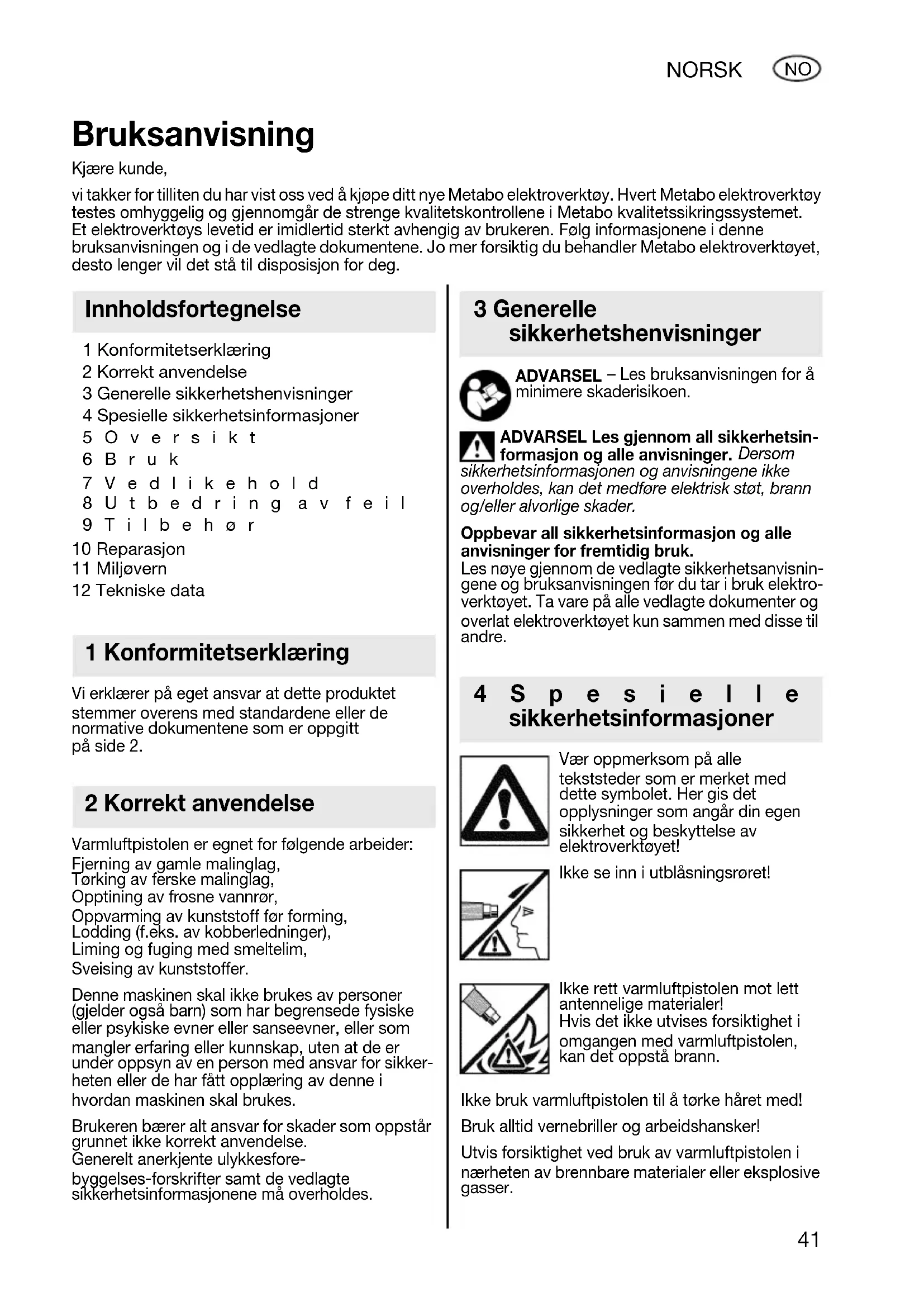 vi takker for tilliten du har vist oss ved å kjøpe ditt nye Metabo elektroverktøy. Hvert Metabo elektroverktøy testes omhyggelig og gjennomgår de strenge kvalitetskontrollene i Metabo kvalitetssikringssystemet. Et elektroverktøys levetid er imidlertid sterkt avhengig av brukeren. Følg informasjonene i denne bruksanvisningen og i de vedlagte dokumentene. Jo mer forsiktig du behandler Metabo elektroverktøyet, desto lenger vil det stå til disposisjon for deg.
