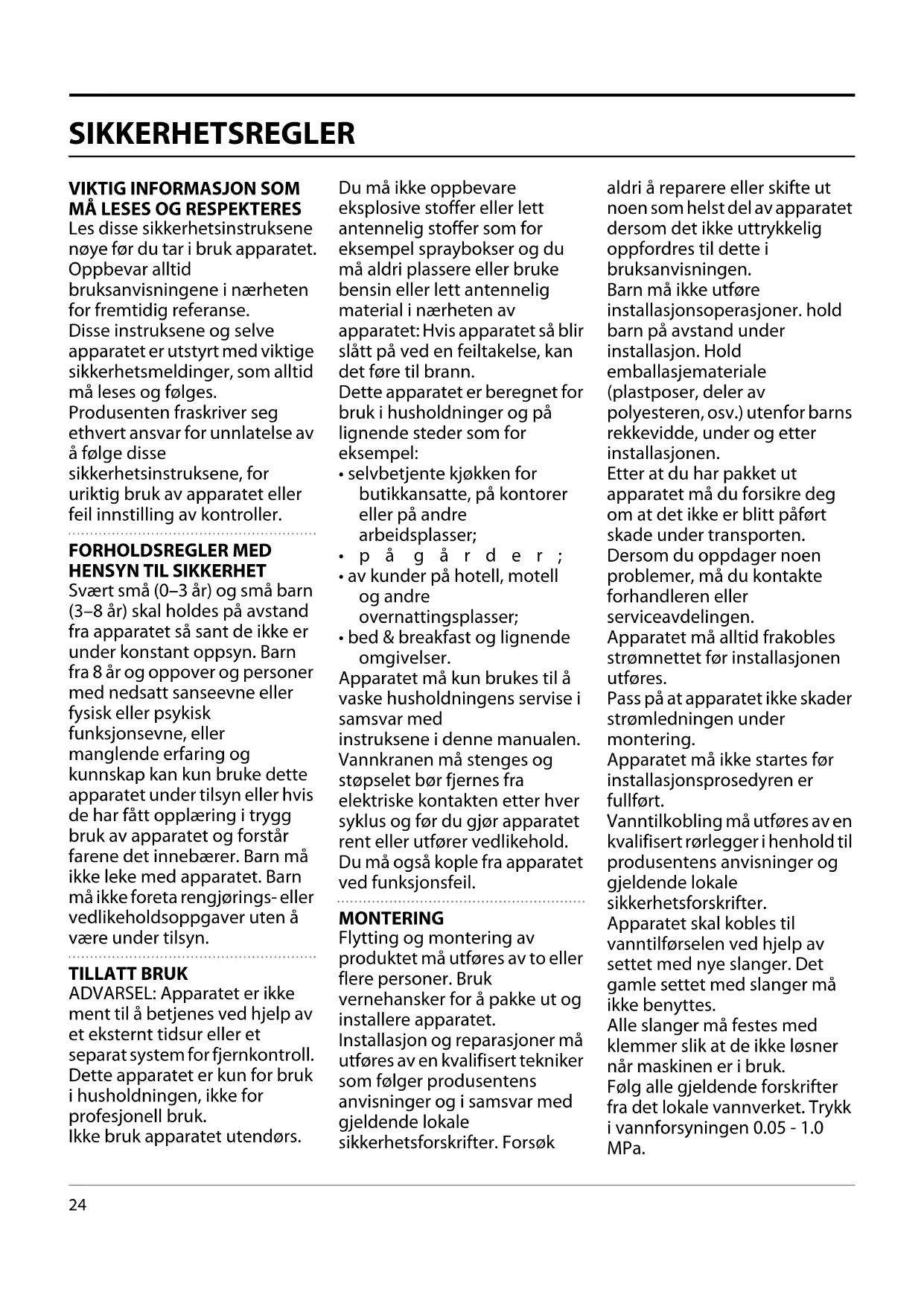 - bed & breakfast og lignende omgivelser. Apparatet må kun brukes til å vaske husholdningens servise i samsvar med instruksene i denne manualen. Vannkranen må stenges og støpselet bør fjernes fra elektriske kontakten etter hver syklus og før du gjør apparatet rent eller utfører vedlikehold. Du må også kople fra apparatet ved funksjonsfeil. MONTERING Flytting og montering av produktet må utføres av to eller flere personer. Bruk vernehansker for å pakke ut og installere apparatet. Installasjon og reparasjoner må utføres av en kvalifisert tekniker som følger produsentens anvisninger og i samsvar med gjeldende lokale sikkerhetsforskrifter. Forsøk aldri å reparere eller skifte ut noen som helst del av apparatet dersom det ikke uttrykkelig oppfordres til dette i bruksanvisningen. Barn må ikke utføre installasjonsoperasjoner. hold barn på avstand under installasjon. Hold emballasjemateriale (plastposer, deler av polyesteren, osv.) utenfor barns rekkevidde, under og etter installasjonen. Etter at du har pakket ut apparatet må du forsikre deg om at det ikke er blitt påført skade under transporten. Dersom du oppdager noen problemer, må du kontakte forhandleren eller serviceavdelingen. Apparatet må alltid frakobles strømnettet før installasjonen utføres. Pass på at apparatet ikke skader strømledningen under montering. Apparatet må ikke startes før installasjonsprosedyren er fullført. Vanntilkobling må utføres av en kvalifisert rørlegger i henhold til produsentens anvisninger og gjeldende lokale sikkerhetsforskrifter. Apparatet skal kobles til vanntilførselen ved hjelp av settet med nye slanger. Det gamle settet med slanger må ikke benyttes. Alle slanger må festes med klemmer slik at de ikke løsner når maskinen er i bruk. Følg alle gjeldende forskrifter fra det lokale vannverket. Trykk i vannforsyningen 0.05 - 1.0 MPa.25 Temperaturen i vanntilførselen avhenger av oppvaskmaskinens modell. Dersom inntakslangen som monteres er merket med "25°C Max", er maksimalt tillatt temperatur til vannet 25°C. for alle de andre modellene er høyeste temperatur 60° C. Kutt aldri slangene. På apparater med vannstoppsystem må heller ikke plastboksen på vanntilførselsslangen dyppes i vann. Hvis slangene ikke er lange nok, ta kontakt med din lokale forhandler. Sørg for at slangene for vanntilførsel og vannavløp er uten krøll eller bukter. Før maskinen tas i bruk må man kontrollere at vanntilførsels- og avløpsslangen er helt vanntette. Begrense tilgang til bakveggen når apparatet er i bruk ved å plassere det mot en vegg eller et møbel. Når du installerer apparatet, må du sørge for at de fire støttebena står stabilt og fast plassert på gulvet, reguler de dersom det er nødvendig, og kontroller at apparatet står helt vannrett ved å benytte et vater. Hvis apparatet befinner seg ved enden av en seksjon, slik at sidepanelet er ubeskyttet, må området rundt hengslene tildekkes for å unngå klemfare. For vaskemaskiner som har ventilasjonsåpninger på basen, må ikke åpningene dekkes til med et teppe. ELEKTRISKE ADVARSLER For at installasjonen skal oppfylle gjeldende sikkerhetsforskrifter, er en allpolet bryter med minimum kontaktåpning på 3 mm påkrevd og apparatet må være jordet. Skift ut nettledningen med en av samme slag dersom den er skadet. Utskiftingen av nettledningen må utføres av en autorisert elektriker i overensstemmelse med produsentens anvisninger og gjeldende sikkerhetsforskrifter. Kontakt et autorisert servicesenter. Dersom støpselet som er montert ikke passer til din kontakt, må du kontakte en kvalifisert elektriker. Strømledningen må være lang nok til at det innebygde apparatet kan tilkobles strømnettet. Ikke dra i strømledningen. Ikke bruk skjøteledninger, flerkontakter eller adaptere. Ikke bruk dette apparatet dersom strømkabelen eller støpselet er skadet, hvis det ikke fungerer som det skal, eller dersom det er blitt skadet eller har falt ned. Hold ledningen borte fra varme overflater. De elektriske komponentene må ikke være tilgjengelige etter installasjonen. Ikke berør apparatet med våte kroppsdeler og ikke betjen apparatet med bare føtter. RIKTIG BRUK Vannet i oppvaskmaskinen kan ikke drikkes. Maksimalt antall kuverter vises i produktarket. Du må ikke la døren stå i åpen posisjon siden en kan snuble i den. Den åpne døren tåler kun tyngden av kurven inklusiv servise. Ikke plasser gjenstander på døren eller sitt eller stå på den. Bruk kun vaskemiddel og rensemiddel som er beregnet på automatiske oppvaskmaskiner. ADVARSEL: Oppvaskmiddel er svært alkaliske. De kan være svært farlig å svelge. Unngå at det kommer i kontakt med hud eller øyne og hold barn på sikker avstand fra oppvaskmaskinen når døren er åpen. Kontroller at vaskemiddel beholderen er tom når vaskesyklusen er avsluttet. Oppbevar oppvaskmiddel, skyllemiddel og salt utenfor barns rekkevidde. ADVARSEL: Kniver og annet redskap med skarpe spisser må plasseres i kurven med spissen vendt nedover eller plasseres i horisontal posisjon. Vannkranen må stenges og støpselet bør fjernes fra elektriske kontakten etter hvert program og før du gjør ren oppvaskmaskinen eller utfører vedlikehold. Du må også kople fra oppvaskmaskinen ved funksjonsfeil.