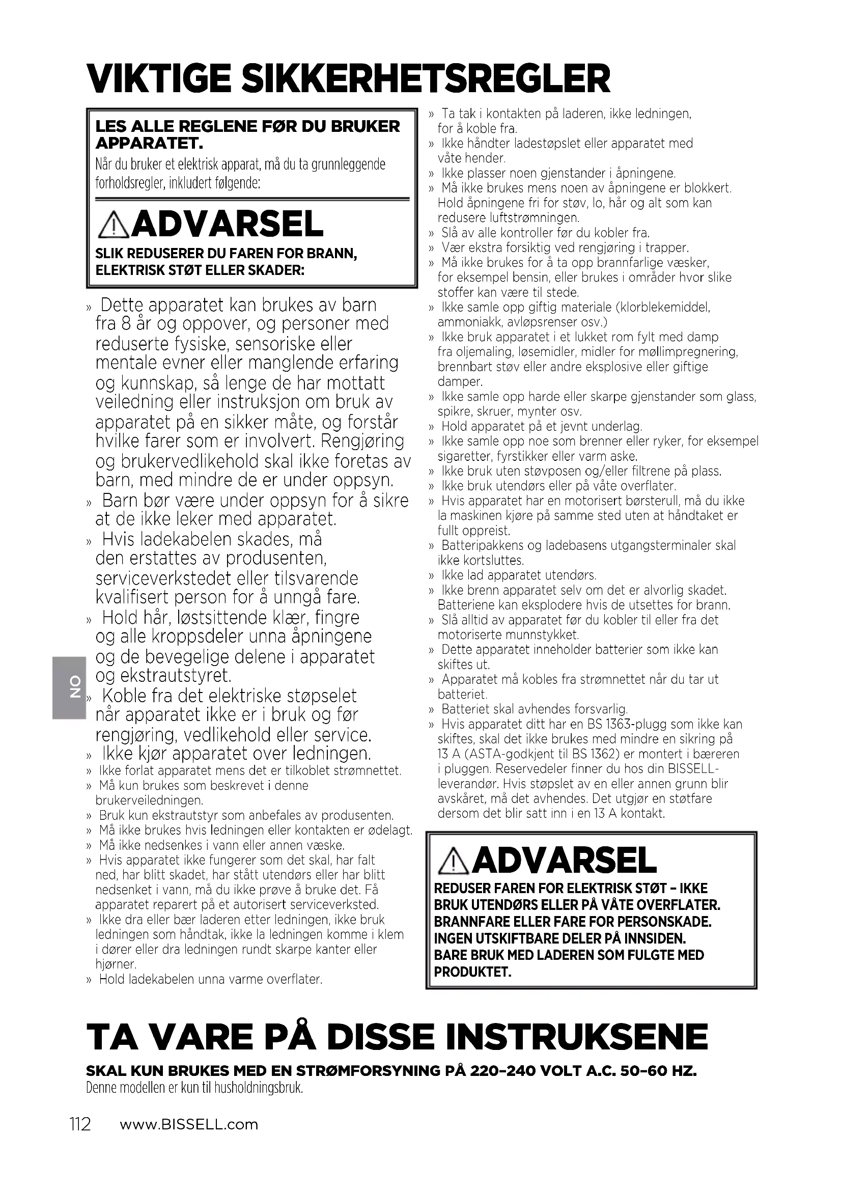VIKTIGE SIKKERHETSREGLER LES ALLE REGLENE FØR DU BRUKER APPARATET. Når du bruker et elektrisk apparat, må du ta grunnleggende forholdsregler, inkludert følgende: ADVARSEL SLIK REDUSERER DU FAREN FOR BRANN, ELEKTRISK STØT ELLER SKADER:» Dette apparatet kan brukes av barn fra 8 år og oppover, og personer med reduserte fysiske, sensoriske eller mentale evner eller manglende erfaring og kunnskap, så lenge de har mottatt veiledning eller instruksjon om bruk av apparatet på en sikker måte, og forstår hvilke farer som er involvert. Rengjøring og brukervedlikehold skal ikke foretas av barn, med mindre de er under oppsyn. » Barn bør være under oppsyn for å sikre at de ikke leker med apparatet. » Hvis ladekabelen skades, må den erstattes av produsenten, serviceverkstedet eller tilsvarende kvalifisert person for å unngå fare. » Hold hår, løstsittende klær, fingre ogalle kroppsdeler unna åpningene ogde bevegelige delene i apparatet ogekstrautstyret. » Koble fra det elektriske støpselet når apparatet ikke er i bruk og før rengjøring, vedlikehold eller service. » Ikke kjør apparatet over ledningen.» Ikke forlat apparatet mens det er tilkoblet strømnettet.» Må kun brukes som beskrevet i denne brukerveiledningen.» Bruk kun ekstrautstyr som anbefales av produsenten.» Må ikke brukes hvis ledningen eller kontakten er ødelagt.» Må ikke nedsenkes i vann eller annen væske.» Hvis apparatet ikke fungerer som det skal, har falt ned, har blitt skadet, har stått utendørs eller har blitt nedsenket i vann, må du ikke prøve å bruke det. Få apparatet reparert på et autorisert serviceverksted.» Ikke dra eller bær laderen etter ledningen, ikke bruk ledningen som håndtak, ikke la ledningen komme i klem i dører eller dra ledningen rundt skarpe kanter eller hjørner.» Hold ladekabelen unna varme overflater.» Ta tak i kontakten på laderen, ikke ledningen, foråkoblefra.» Ikke håndter ladestøpslet eller apparatet med våtehender.» Ikke plasser noen gjenstander i åpningene.» Må ikke brukes mens noen av åpningene er blokkert. Hold åpningene fri for støv, lo, hår og alt som kan redusere luftstrømningen.» Slå av alle kontroller før du kobler fra.» Vær ekstra forsiktig ved rengjøring i trapper.» Må ikke brukes for å ta opp brannfarlige væsker, foreksempel bensin, eller brukes i områder hvor slike stoffer kan være til stede.» Ikke samle opp giftig materiale (klorblekemiddel, ammoniakk, avløpsrenser osv.)» Ikke bruk apparatet i et lukket rom fylt med damp fraoljemaling, løsemidler, midler for møllimpregnering, brennbart støv eller andre eksplosive eller giftige damper.» Ikke samle opp harde eller skarpe gjenstander som glass, spikre, skruer, mynter osv.» Hold apparatet på et jevnt underlag.» Ikke samle opp noe som brenner eller ryker, for eksempel sigaretter, fyrstikker eller varm aske.» Ikke bruk uten støvposen og/eller filtrene på plass.» Ikke bruk utendørs eller på våte overflater.» Hvis apparatet har en motorisert børsterull, må du ikke lamaskinen kjøre på samme sted uten at håndtaket er fullt oppreist.» Batteripakkens og ladebasens utgangsterminaler skal ikke kortsluttes.» Ikke lad apparatet utendørs.» Ikke brenn apparatet selv om det er alvorlig skadet. Batteriene kan eksplodere hvis de utsettes for brann.» Slå alltid av apparatet før du kobler til eller fra det motoriserte munnstykket.» Dette apparatet inneholder batterier som ikke kan skiftesut.» Apparatet må kobles fra strømnettet når du tar ut batteriet.» Batteriet skal avhendes forsvarlig.» Hvis apparatet ditt har en BS 1363-plugg som ikke kan skiftes, skal det ikke brukes med mindre en sikring på 13 A (ASTA-godkjent til BS 1362) er montert i bæreren i pluggen. Reservedeler finner du hos din BISSELL-leverandør. Hvis støpslet av en eller annen grunn blir avskåret, må det avhendes. Det utgjør en støtfare dersom det blir satt inn i en 13A kontakt.