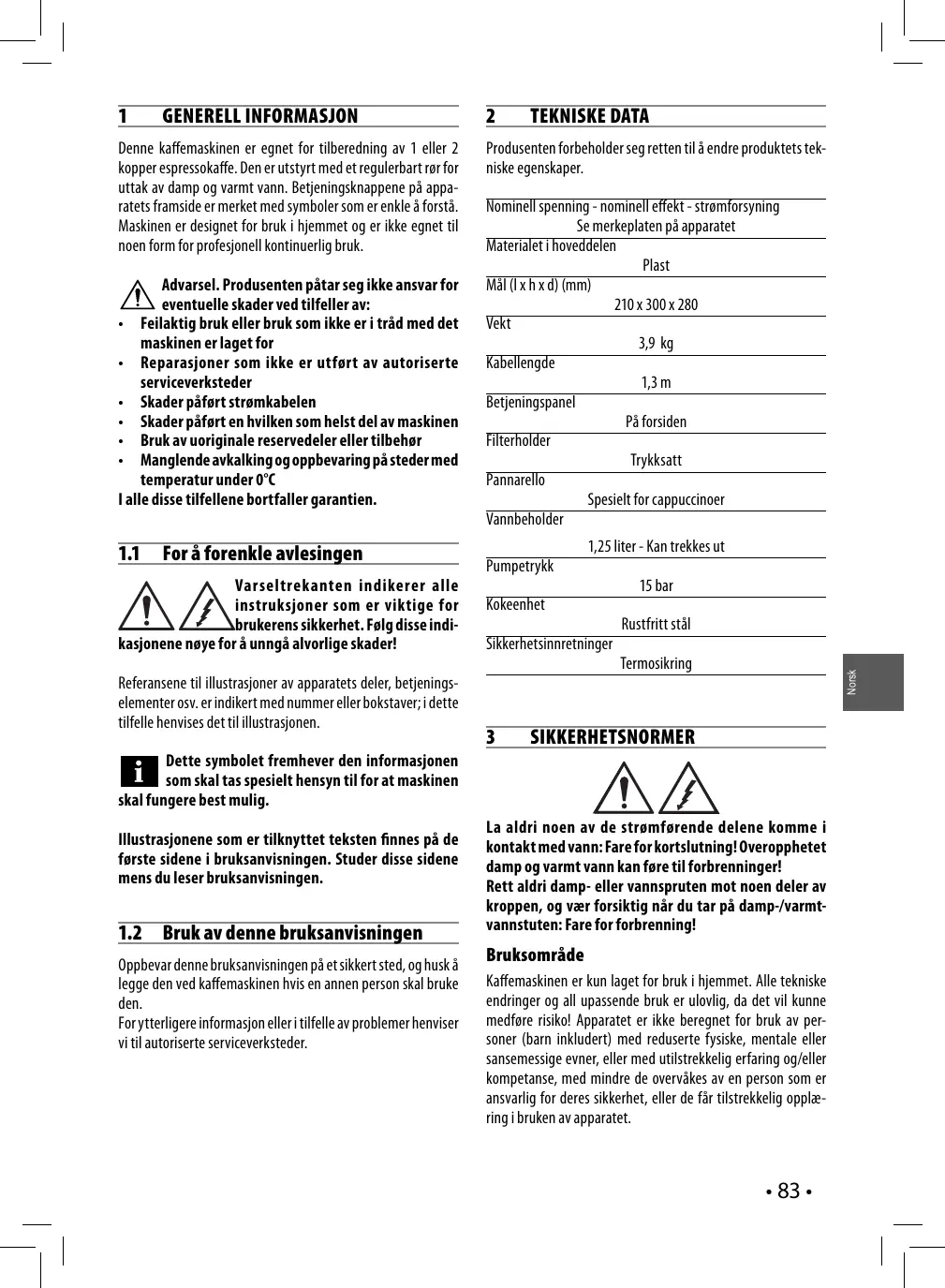GENERELL INFORMASJON Denne kaffemaskinen er egnet for tilberedning av 1 eller 2 kopper espressokaffe. Den er utstyrt med et regulerbart rør for uttak av damp og varmt vann. Betjeningsknappene på apparatets framside er merket med symboler som er enkle å forstå. Maskinen er designet for bruk i hjemmet og er ikke egnet til noen form for profesjonell kontinuerlig bruk. Advarsel. Produsenten påtar seg ikke ansvar for eventuelle skader ved tilfeller av: • Feilaktig bruk eller bruk som ikke er i tråd med det maskinen er laget for • Reparasjoner som ikke er utført av autoriserte serviceverksteder • Skader påført strømkabelen • Skader påført en hvilken som helst del av maskinen • Bruk av uoriginale reservedeler eller tilbehør • Manglende avkalking og oppbevaring på steder med temperatur under 0°C I alle disse tilfellene bortfaller garantien.