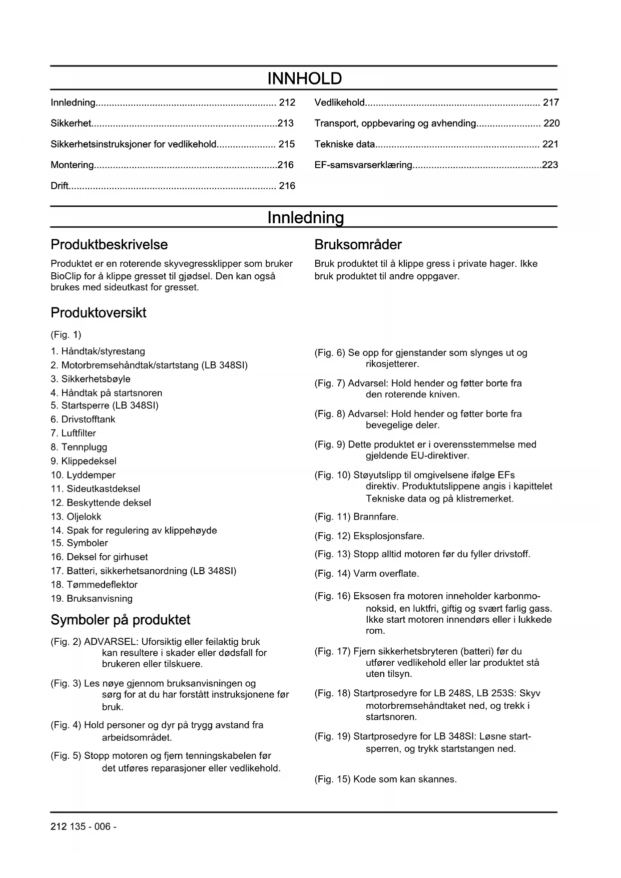 Symboler på produktet (Fig. 2) ADVARSEL: Uforsiktig eller feilaktig bruk kan resultere i skader eller dødsfall for brukeren eller tilskuere. (Fig. 3) Les nøye gjennom bruksanvisningen og sørg for at du har forstått instruksjonene før bruk. (Fig. 4) Hold personer og dyr på trygg avstand fra arbeidsområdet. (Fig. 5) Stopp motoren og fjern tenningskabelen før det utføres reparasjoner eller vedlikehold. (Fig. 6) Se opp for gjenstander som slynges ut og rikosjetterer. (Fig. 7) Advarsel: Hold hender og føtter borte fra den roterende kniven. (Fig. 8) Advarsel: Hold hender og føtter borte fra bevegelige deler. (Fig. 9) Dette produktet er i overensstemmelse med gjeldende EU-direktiver. (Fig. 10) Støyutslipp til omgivelsene ifølge EFs direktiv. Produktutslippene angis i kapittelet Tekniske data og på klistremerket. (Fig. 11) Brannfare. (Fig. 12) Eksplosjonsfare. (Fig. 13) Stopp alltid motoren før du fyller drivstoff. (Fig. 14) Varm overflate. (Fig. 16) Eksosen fra motoren inneholder karbonmo- noksid, en luktfri, giftig og svært farlig gass. Ikke start motoren innendørs eller i lukkede rom. (Fig. 17) Fjern sikkerhetsbryteren (batteri) før du utfører vedlikehold eller lar produktet stå uten tilsyn. (Fig. 18) Startprosedyre for LB 248S, LB 253S: Skyv motorbremsehåndtaket ned, og trekk i startsnoren. (Fig. 19) Startprosedyre for LB 348SI: Løsne start- sperren, og trykk startstangen ned. (Fig. 15) Kode som kan skannes. 212 135 - 006 -Merk: Øvrige symboler/klistremerker angitt på produktet gjelder sertifiseringskrav for enkelte markeder. Produktansvar Som nevnt i lovverket om produktansvar er vi ikke ansvarlig for skader som produktet vårt forårsaker, i følgende tilfeller:
