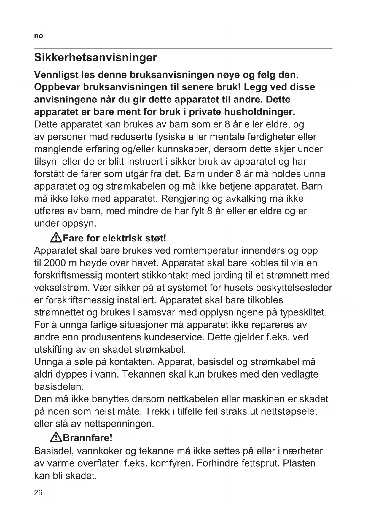 Sikkerhetsanvisninger Vennligst les denne bruksanvisningen nøye og følg den. Oppbevar bruksanvisningen til senere bruk! Legg ved disse anvisningene når du gir dette apparatet til andre. Dette apparatet er bare ment for bruk i private husholdninger. Dette apparatet kan brukes av barn som er 8 år eller eldre, og av personer med reduserte fysiske eller mentale ferdigheter eller manglende erfaring og/eller kunnskaper, dersom dette skjer under tilsyn, eller de er blitt instruert i sikker bruk av apparatet og har forstått de farer som utgår fra det. Barn under 8 år må holdes unna apparatet og og strømkabelen og må ikke betjene apparatet. Barn må ikke leke med apparatet. Rengjøring og avkalking må ikke utføres av barn, med mindre de har fylt 8 år eller er eldre og er under oppsyn. WFare for elektrisk støt! Apparatet skal bare brukes ved romtemperatur innendørs og opp til 2000 m høyde over havet. Apparatet skal bare kobles til via en forskriftsmessig montert stikkontakt med jording til et strømnett med vekselstrøm. Vær sikker på at systemet for husets beskyttelsesleder er forskriftsmessig installert. Apparatet skal bare tilkobles strømnettet og brukes i samsvar med opplysningene på typeskiltet. For å unngå farlige situasjoner må apparatet ikke repareres av andre enn produsentens kundeservice. Dette gjelder f.eks. ved utskifting av en skadet strømkabel. Unngå å søle på kontakten. Apparat, basisdel og strømkabel må aldri dyppes i vann. Tekannen skal kun brukes med den vedlagte basisdelen. Den må ikke benyttes dersom nettkabelen eller maskinen er skadet på noen som helst måte. Trekk i tilfelle feil straks ut nettstøpselet eller slå av nettspenningen. WBrannfare! Basisdel, vannkoker og tekanne må ikke settes på eller i nærheter av varme overflater, f.eks. komfyren. Forhindre fettsprut. Plasten kan bli skadet.27