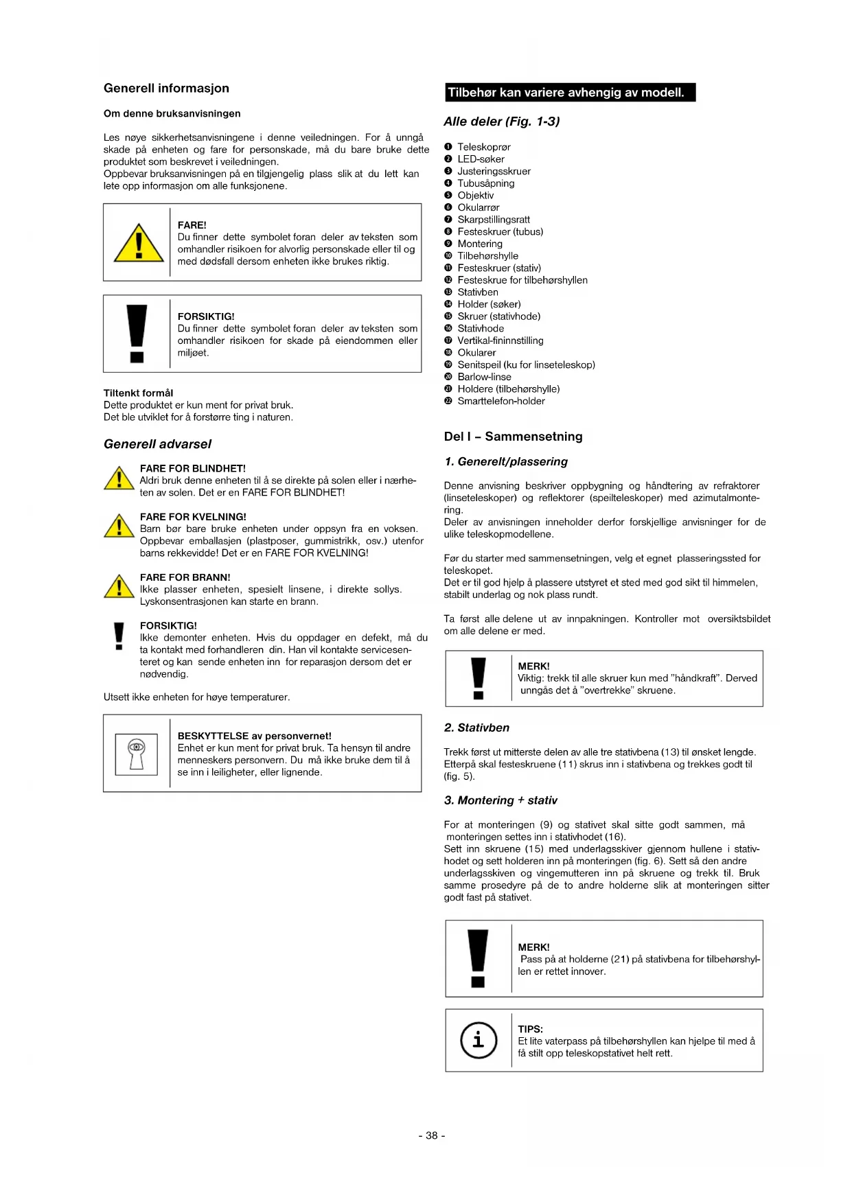 Denne anvisning beskriver oppbygning og håndtering av refraktorer (linseteleskoper) og reflektorer (speilteleskoper) med azimutalmonte- ring. Deler av anvisningen inneholder derfor forskjellige anvisninger for de ulike teleskopmodellene. Før du starter med sammensetningen, velg et egnet plasseringssted for teleskopet. Det er til god hjelp å plassere utstyret et sted med god sikt til himmelen, stabilt underlag og nok plass rundt. Ta først alle delene ut av innpakningen. Kontroller mot oversiktsbildet om alle delene er med. MERK! Viktig: trekk til alle skruer kun med ”håndkraft”. Derved unngås det å ”overtrekke” skruene.