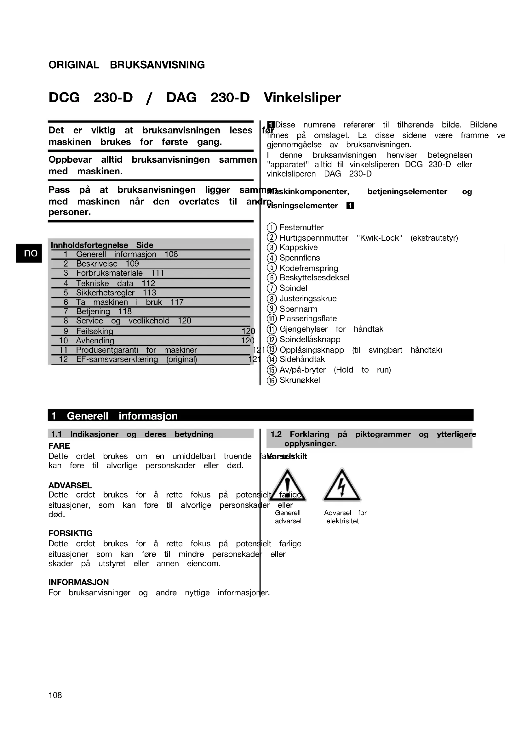 Printed: 20.11.2013 | Doc-Nr: PUB / 5069494 / 000 / 02ORIGINAL BRUKSANVISNING DCG 230‑D / DAG 230‑D Vinkelsliper Det er viktig at bruksanvisningen leses før maskinen brukes for første gang. Oppbevar alltid bruksanvisningen sammen med maskinen. Pass på at bruksanvisningen ligger sammen med maskinen når den overlates til andre personer. Innholdsfortegnelse Side1 Generell informasjon 1082 Beskrivelse 1093 Forbruksmateriale 1114 Tekniske data 1125 Sikkerhetsregler 1136 Ta maskinen i bruk 1177 Betjening 1188 Service og vedlikehold 1209 Feilsøking 12010 Avhending 12011 Produsentgaranti for maskiner 12112 EF-samsvarserklæring (original) 1211 Disse numrene refererer til tilhørende bilde. Bildenefinnes på omslaget. La disse sidene være framme vedgjennomgåelse av bruksanvisningen. I denne bruksanvisningen henviser betegnelsen "apparatet" alltid til vinkelsliperen DCG 230‑D eller vinkelsliperen DAG 230‑DMaskinkomponenter, betjeningselementer ogvisningselementer 1 Festemutter Hurtigspennmutter "Kwik-Lock" (ekstrautstyr) Kappskive Spennflens Kodefremspring Beskyttelsesdeksel Spindel Justeringsskrue Spennarm Plasseringsflate Gjengehylser for håndtak Spindellåsknapp Opplåsingsknapp (til svingbart håndtak) Sidehåndtak Av/på-bryter (Hold to run) Skrunøkkel 1 Generell informasjon