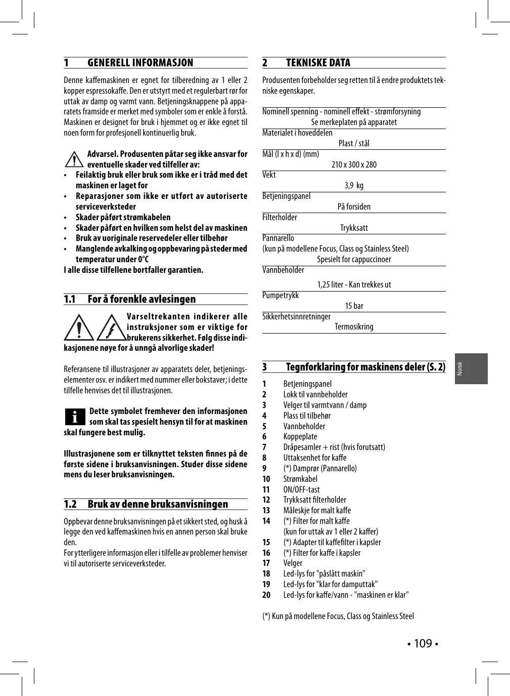 TEKNISKE DATA Produsenten forbeholder seg retten til å endre produktets tekniske egenskaper. Nominell spenning - nominell effekt - strømforsyning Se merkeplaten på apparatet Materialet i hoveddelen Plast / stål Mål (l x h x d) (mm) 210 x 300 x 280 Vekt 3,9 kg Betjeningspanel På forsiden Filterholder Trykksatt Pannarello (kun på modellene Focus, Class og Stainless Steel) Spesielt for cappuccinoer Vannbeholder 1,25 liter - Kan trekkes ut
