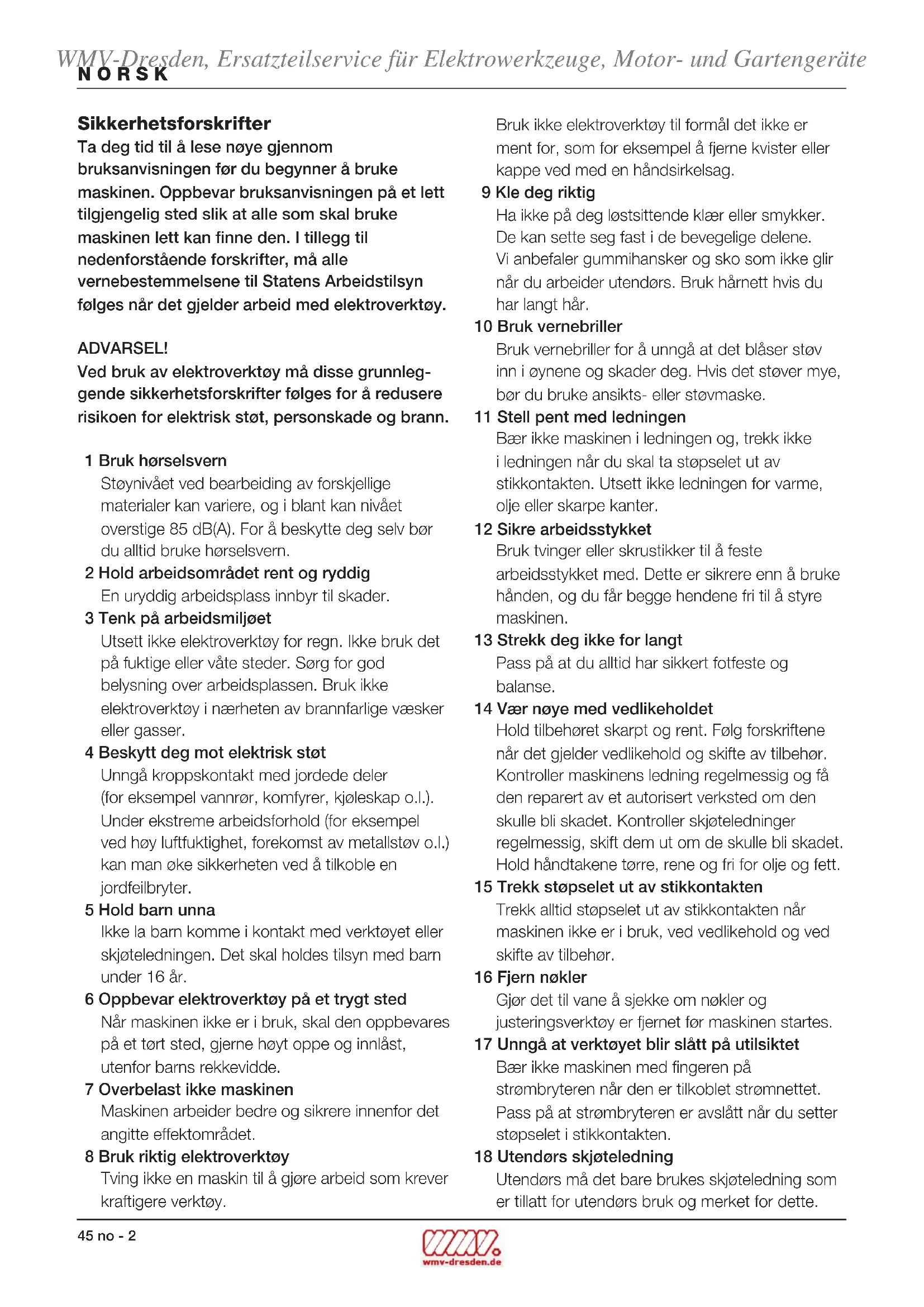 Director Engineering and Product Development Horst Großmann Elu International, Richard-Klinger-Straße 40, D-65510, Idstein, Tyskland WMV-Dresden, Ersatzteilservice für Elektrowerkzeuge, Motor- und Gartengeräte45 no - 2 NORSK Sikkerhetsforskrifter Ta deg tid til å lese nøye gjennom bruksanvisningen før du begynner å bruke maskinen. Oppbevar bruksanvisningen på et lett tilgjengelig sted slik at alle som skal bruke maskinen lett kan finne den. I tillegg til nedenforstående forskrifter, må alle vernebestemmelsene til Statens Arbeidstilsyn følges når det gjelder arbeid med elektroverktøy. ADVARSEL! Ved bruk av elektroverktøy må disse grunnleg- gende sikkerhetsforskrifter følges for å redusere risikoen for elektrisk støt, personskade og brann. 1 Bruk hørselsvern Støynivået ved bearbeiding av forskjellige materialer kan variere, og i blant kan nivået overstige 85 dB(A). For å beskytte deg selv bør du alltid bruke hørselsvern. 2 Hold arbeidsområdet rent og ryddig En uryddig arbeidsplass innbyr til skader. 3 Tenk på arbeidsmiljøet Utsett ikke elektroverktøy for regn. Ikke bruk det på fuktige eller våte steder. Sørg for god belysning over arbeidsplassen. Bruk ikke elektroverktøy i nærheten av brannfarlige væsker eller gasser. 4 Beskytt deg mot elektrisk støt Unngå kroppskontakt med jordede deler (for eksempel vannrør, komfyrer, kjøleskap o.l.). Under ekstreme arbeidsforhold (for eksempel ved høy luftfuktighet, forekomst av metallstøv o.l.) kan man øke sikkerheten ved å tilkoble en jordfeilbryter. 5 Hold barn unna Ikke la barn komme i kontakt med verktøyet eller skjøteledningen. Det skal holdes tilsyn med barn under 16 år. 6 Oppbevar elektroverktøy på et trygt sted Når maskinen ikke er i bruk, skal den oppbevares på et tørt sted, gjerne høyt oppe og innlåst, utenfor barns rekkevidde. 7 Overbelast ikke maskinen Maskinen arbeider bedre og sikrere innenfor det angitte effektområdet. 8 Bruk riktig elektroverktøy Tving ikke en maskin til å gjøre arbeid som krever kraftigere verktøy. Bruk ikke elektroverktøy til formål det ikke er ment for, som for eksempel å fjerne kvister eller kappe ved med en håndsirkelsag. 9 Kle deg riktig Ha ikke på deg løstsittende klær eller smykker. De kan sette seg fast i de bevegelige delene. Vi anbefaler gummihansker og sko som ikke glir når du arbeider utendørs. Bruk hårnett hvis du har langt hår. 10 Bruk vernebriller Bruk vernebriller for å unngå at det blåser støv inn i øynene og skader deg. Hvis det støver mye, bør du bruke ansikts- eller støvmaske. 11 Stell pent med ledningen Bær ikke maskinen i ledningen og, trekk ikke i ledningen når du skal ta støpselet ut av stikkontakten. Utsett ikke ledningen for varme, olje eller skarpe kanter. 12 Sikre arbeidsstykket Bruk tvinger eller skrustikker til å feste arbeidsstykket med. Dette er sikrere enn å bruke hånden, og du får begge hendene fri til å styre maskinen. 13 Strekk deg ikke for langt Pass på at du alltid har sikkert fotfeste og balanse. 14 Vær nøye med vedlikeholdet Hold tilbehøret skarpt og rent. Følg forskriftene når det gjelder vedlikehold og skifte av tilbehør. Kontroller maskinens ledning regelmessig og få den reparert av et autorisert verksted om den skulle bli skadet. Kontroller skjøteledninger regelmessig, skift dem ut om de skulle bli skadet. Hold håndtakene tørre, rene og fri for olje og fett. 15 Trekk støpselet ut av stikkontakten Trekk alltid støpselet ut av stikkontakten når maskinen ikke er i bruk, ved vedlikehold og ved skifte av tilbehør. 16 Fjern nøkler Gjør det til vane å sjekke om nøkler og justeringsverktøy er fjernet før maskinen startes. 17 Unngå at verktøyet blir slått på utilsiktet Bær ikke maskinen med fingeren på strømbryteren når den er tilkoblet strømnettet. Pass på at strømbryteren er avslått når du setter støpselet i stikkontakten. 18 Utendørs skjøteledning Utendørs må det bare brukes skjøteledning som er tillatt for utendørs bruk og merket for dette. WMV-Dresden, Ersatzteilservice für Elektrowerkzeuge, Motor- und GartengeräteNORSK no - 3 46 19 Vær oppmerksom Se på det du gjør. Bruk sunn fornuft. Bruk ikke maskinen når du er trett. 20 Sjekk skadede deler før du setter støpselet i stikkontakten Før fortsatt bruk av maskinen skal eventuelle skadede deler eller deksler kontrolleres nøye for å bringe på det rene om de fungerer riktig og utfører det de skal. Kontroller justeringen av bevegelige deler, om de sitter i klemme, om deler er brukket. Sjekk at alt er riktig montert og er slik det skal være. En del eller et deksel som er skadet, skal repareres eller skiftes ut av et autorisert verksted dersom ikke annet er angitt i bruksanvisningen. Ødelagte brytere skal repareres av et autorisert serviceverksted. Bruk ikke maskinen hvis den ikke kan slås av og på med bryteren. 21 ADVARSEL! Bruk bare tilbehør og utstyr som anbefales i bruksanvisningen og i katalogene. Bruk av annet verktøy eller tilbehør enn det som anbefales i bruksanvisningen eller i katalogene kan medføre en mulig risiko for personskade. 22 La verktøyet repareres av et autorisert Elu serviceverksted Dette elektroverktøyet er i samsvar med gjeldende sikkerhetsforskrifter. Unngå risiko: Overlat alltid reparasjon av elektriske apparater til kvalifisert servicepersonale. Ekstra sikkerhetsregler for freser