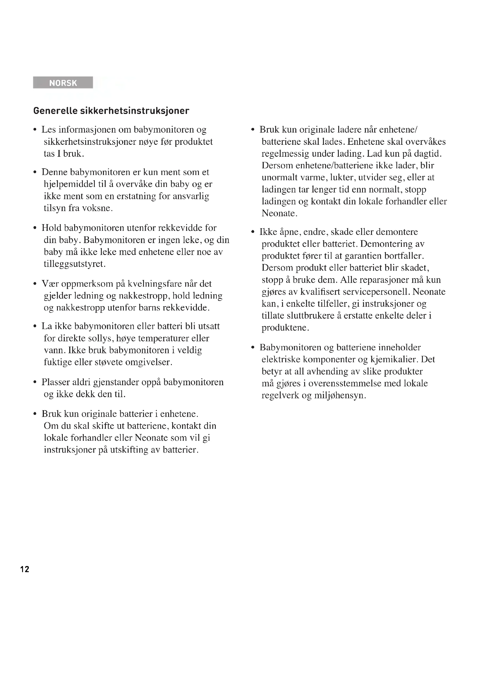 - Les informasjonen om babymonitoren og sikkerhetsinstruksjoner nøye før produktet tas I bruk.