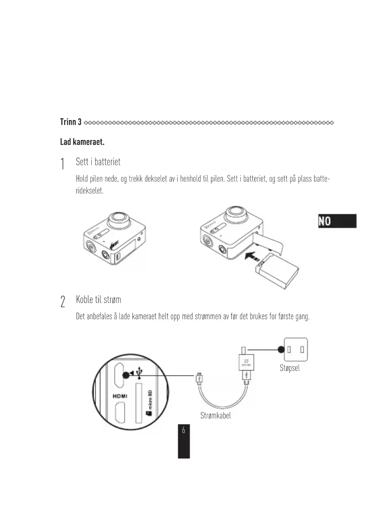 Hold pilen nede, og trekk dekselet av i henhold til pilen. Sett i batteriet, og sett på plass batte- ridekselet. Koble til strøm