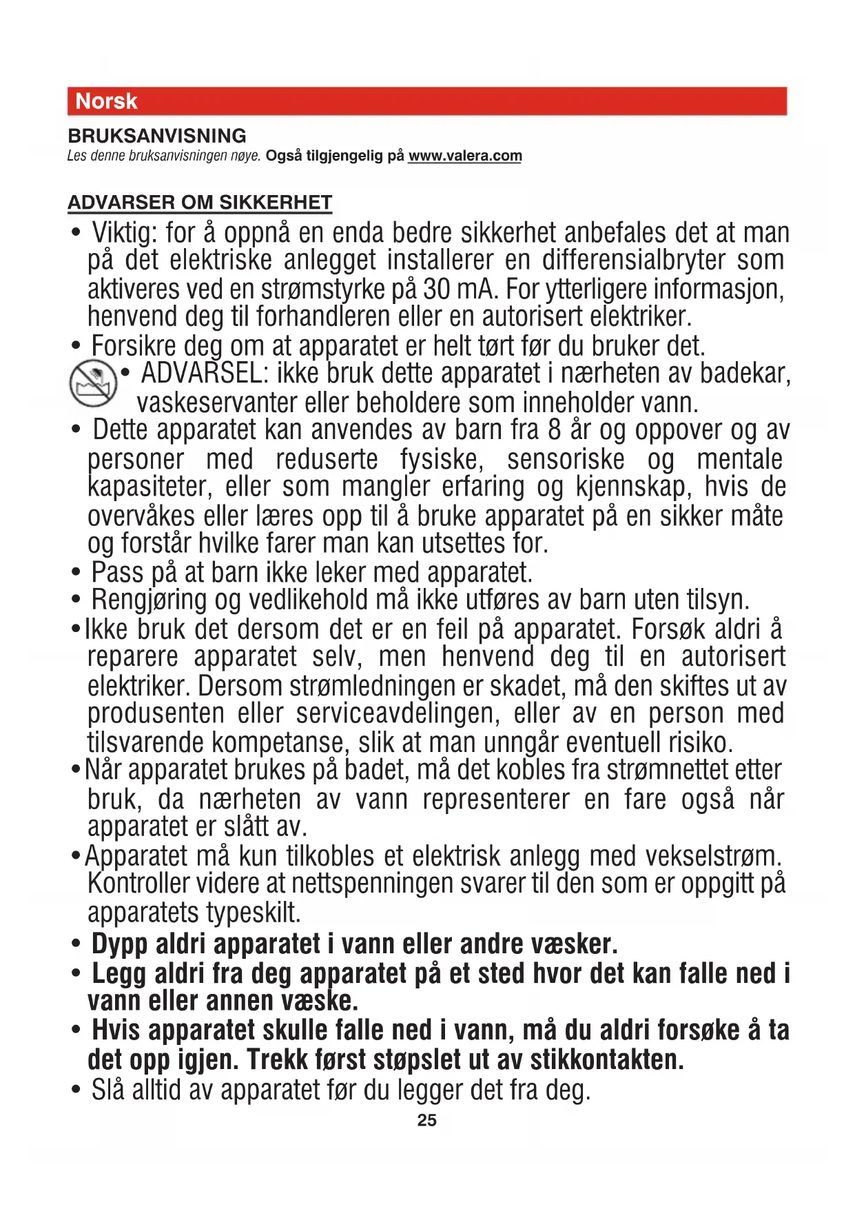 reparert av uautoriserte personer. Ved feil returneres apparatet godt innpakket og med garantibevis med dato og stempel fra selgeren til et av våre autoriserte serviceverksteder eller til selgeren, som sørger for å levere det til den offisielle importøren for garantireparasjon. VIKTIG INGEN av hårtørkerne som er listet i disse bruksvilkårene er egnet for installasjon og bruk i offentlige anlegg, treningssentre, wellness/fitness-klubber, spa, osv. med høy besøksfrekvens. For installasjon og bruk i små offentlige anlegg, treningssentre, wellness/fitness-klubber, spa, osv. med lav besøksfrekvens, anbefaler Valera kun følgende modeller: SN9000 P • 583.11/P • 584.02/IP. VALERA er et registrert varemerke for Ligo Electric S.A. - Sveits28 Svenska BRUKSANVISNING Läs denna bruksanvisning noggrant. Finns även på www.valera.com SAKERHETSANVISNINGAR