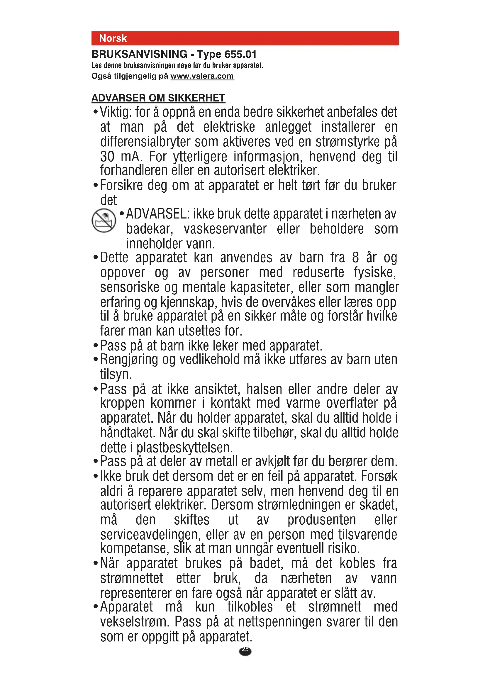 - ADVARSEL: ikke bruk dette apparatet i nærheten av badekar, vaskeservanter eller beholdere som inneholder vann.