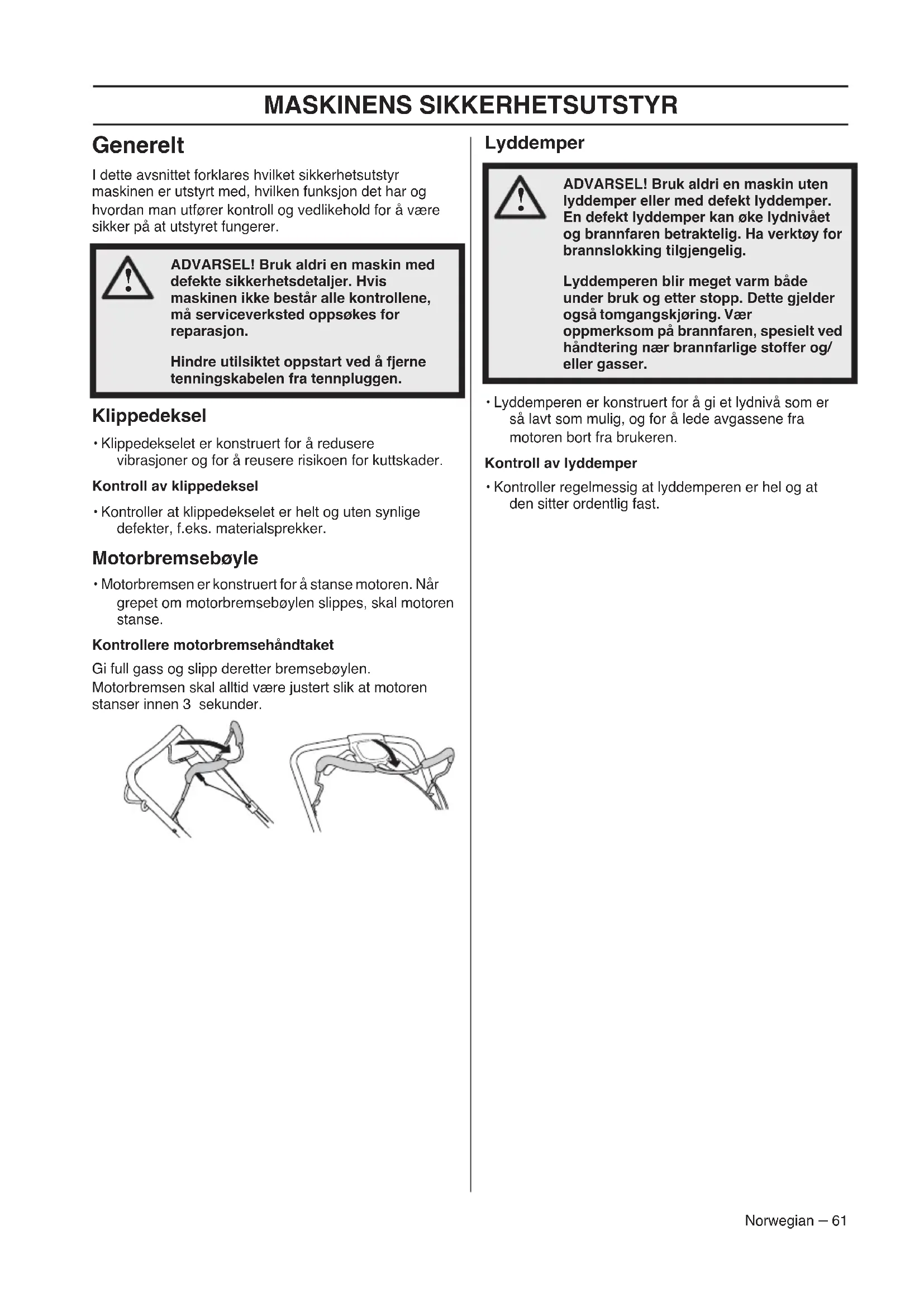 1 Motorbremsebøyle 2 Kjørehåndtak 3 El-start M46-190AWREX 4 Starthåndtak 5 Oppsamler 6 Håndtak, håndtakets høyde 7 Klippehøydehendel 8 Batteri 9 Luftfilter 10 Primermembran M51-190WR 11 Brenselpåfylling 12 Tennplugg 13 Lyddemper 14 Klippedeksel 15 Vanntilkopling 16 Peilepinne/oljepåfylling 17 Kniv 18 Fjærskive 19 Knivbolt 20 Batteriladere M46-190AWREX 21 BruksanvisningMASKINENS SIKKERHETSUTSTYR Norwegian – 61 Generelt I dette avsnittet forklares hvilket sikkerhetsutstyr maskinen er utstyrt med, hvilken funksjon det har og hvordan man utfører kontroll og vedlikehold for å være sikker på at utstyret fungerer. Klippedeksel