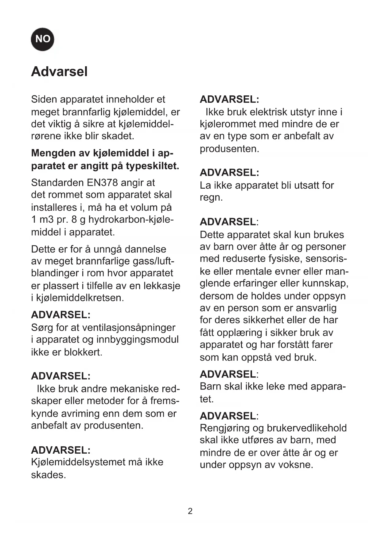 Advarsel Siden apparatet inneholder et meget brannfarlig kjølemiddel, er det viktig å sikre at kjølemiddel- rørene ikke blir skadet. Mengden av kjølemiddel i ap- paratet er angitt på typeskiltet. Standarden EN378 angir at det rommet som apparatet skal installeres i, må ha et volum på 1 m3 pr. 8 g hydrokarbon-kjøle- middel i apparatet. Dette er for å unngå dannelse av meget brannfarlige gass/luft- blandinger i rom hvor apparatet er plassert i tilfelle av en lekkasje i kjølemiddelkretsen. ADVARSEL: Sørg for at ventilasjonsåpninger i apparatet og innbyggingsmodul ikke er blokkert. ADVARSEL: Ikke bruk andre mekaniske red- skaper eller metoder for å frems- kynde avriming enn dem som er anbefalt av produsenten. ADVARSEL: Kjølemiddelsystemet må ikke skades. ADVARSEL: Ikke bruk elektrisk utstyr inne i kjølerommet med mindre de er av en type som er anbefalt av produsenten. ADVARSEL: La ikke apparatet bli utsatt for regn. ADVARSEL: Dette apparatet skal kun brukes av barn over åtte år og personer med reduserte fysiske, sensoris- ke eller mentale evner eller man- glende erfaringer eller kunnskap, dersom de holdes under oppsyn av en person som er ansvarlig for deres sikkerhet eller de har fått opplæring i sikker bruk av apparatet og har forstått farer som kan oppstå ved bruk. ADVARSEL: Barn skal ikke leke med appara- tet. ADVARSEL: Rengjøring og brukervedlikehold skal ikke utføres av barn, med mindre de er over åtte år og er under oppsyn av voksne.3