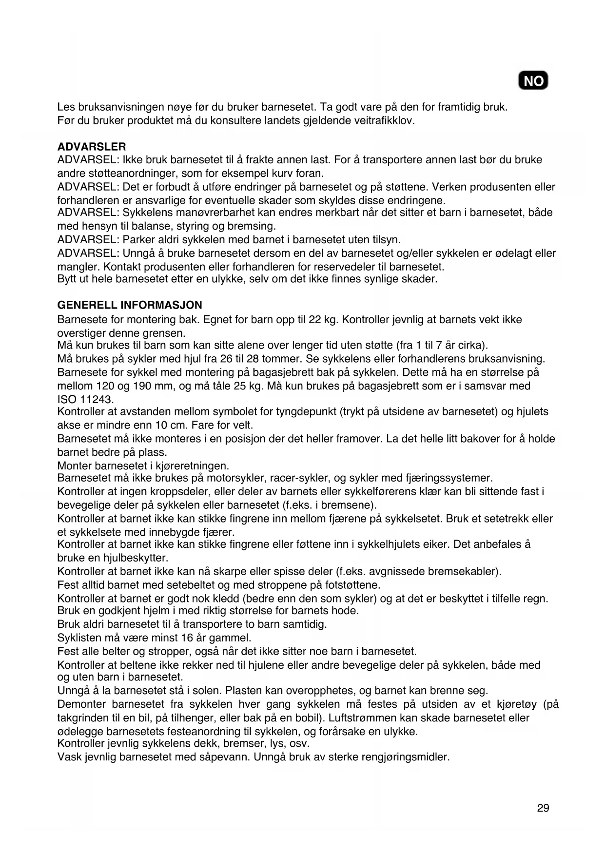 SV29 Les bruksanvisningen nøye før du bruker barnesetet. Ta godt vare på den for framtidig bruk. Før du bruker produktet må du konsultere landets gjeldende veitrakklov. ADVARSLER ADVARSEL: Ikke bruk barnesetet til å frakte annen last. For å transportere annen last bør du bruke andre støtteanordninger, som for eksempel kurv foran. ADVARSEL: Det er forbudt å utføre endringer på barnesetet og på støttene. Verken produsenten eller forhandleren er ansvarlige for eventuelle skader som skyldes disse endringene. ADVARSEL: Sykkelens manøvrerbarhet kan endres merkbart når det sitter et barn i barnesetet, både med hensyn til balanse, styring og bremsing. ADVARSEL: Parker aldri sykkelen med barnet i barnesetet uten tilsyn. ADVARSEL: Unngå å bruke barnesetet dersom en del av barnesetet og/eller sykkelen er ødelagt eller mangler. Kontakt produsenten eller forhandleren for reservedeler til barnesetet. Bytt ut hele barnesetet etter en ulykke, selv om det ikke nnes synlige skader. GENERELL INFORMASJON Barnesete for montering bak. Egnet for barn opp til 22 kg. Kontroller jevnlig at barnets vekt ikke overstiger denne grensen. Må kun brukes til barn som kan sitte alene over lenger tid uten støtte (fra 1 til 7 år cirka). Må brukes på sykler med hjul fra 26 til 28 tommer. Se sykkelens eller forhandlerens bruksanvisning. Barnesete for sykkel med montering på bagasjebrett bak på sykkelen. Dette må ha en størrelse på mellom 120 og 190 mm, og må tåle 25 kg. Må kun brukes på bagasjebrett som er i samsvar med ISO 11243. Kontroller at avstanden mellom symbolet for tyngdepunkt (trykt på utsidene av barnesetet) og hjulets akse er mindre enn 10 cm. Fare for velt. Barnesetet må ikke monteres i en posisjon der det heller framover. La det helle litt bakover for å holde barnet bedre på plass. Monter barnesetet i kjøreretningen. Barnesetet må ikke brukes på motorsykler, racer-sykler, og sykler med fjæringssystemer. Kontroller at ingen kroppsdeler, eller deler av barnets eller sykkelførerens klær kan bli sittende fast i bevegelige deler på sykkelen eller barnesetet (f.eks. i bremsene). Kontroller at barnet ikke kan stikke ngrene inn mellom fjærene på sykkelsetet. Bruk et setetrekk eller et sykkelsete med innebygde fjærer. Kontroller at barnet ikke kan stikke ngrene eller føttene inn i sykkelhjulets eiker. Det anbefales å bruke en hjulbeskytter. Kontroller at barnet ikke kan nå skarpe eller spisse deler (f.eks. avgnissede bremsekabler). Fest alltid barnet med setebeltet og med stroppene på fotstøttene. Kontroller at barnet er godt nok kledd (bedre enn den som sykler) og at det er beskyttet i tilfelle regn. Bruk en godkjent hjelm i med riktig størrelse for barnets hode. Bruk aldri barnesetet til å transportere to barn samtidig. Syklisten må være minst 16 år gammel. Fest alle belter og stropper, også når det ikke sitter noe barn i barnesetet. Kontroller at beltene ikke rekker ned til hjulene eller andre bevegelige deler på sykkelen, både med og uten barn i barnesetet. Unngå å la barnesetet stå i solen. Plasten kan overopphetes, og barnet kan brenne seg. Demonter barnesetet fra sykkelen hver gang sykkelen må festes på utsiden av et kjøretøy (på takgrinden til en bil, på tilhenger, eller bak på en bobil). Luftstrømmen kan skade barnesetet eller ødelegge barnesetets festeanordning til sykkelen, og forårsake en ulykke. Kontroller jevnlig sykkelens dekk, bremser, lys, osv. Vask jevnlig barnesetet med såpevann. Unngå bruk av sterke rengjøringsmidler. NO30