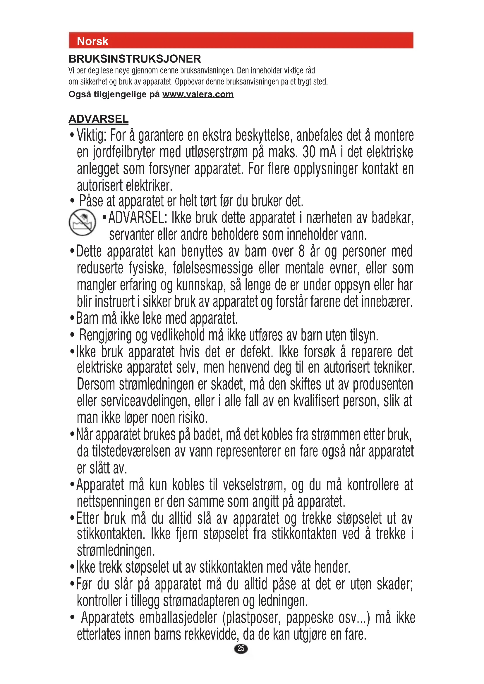- ADVARSEL: Ikke bruk dette apparatet i nærheten av badekar, servanter eller andre beholdere som inneholder vann.