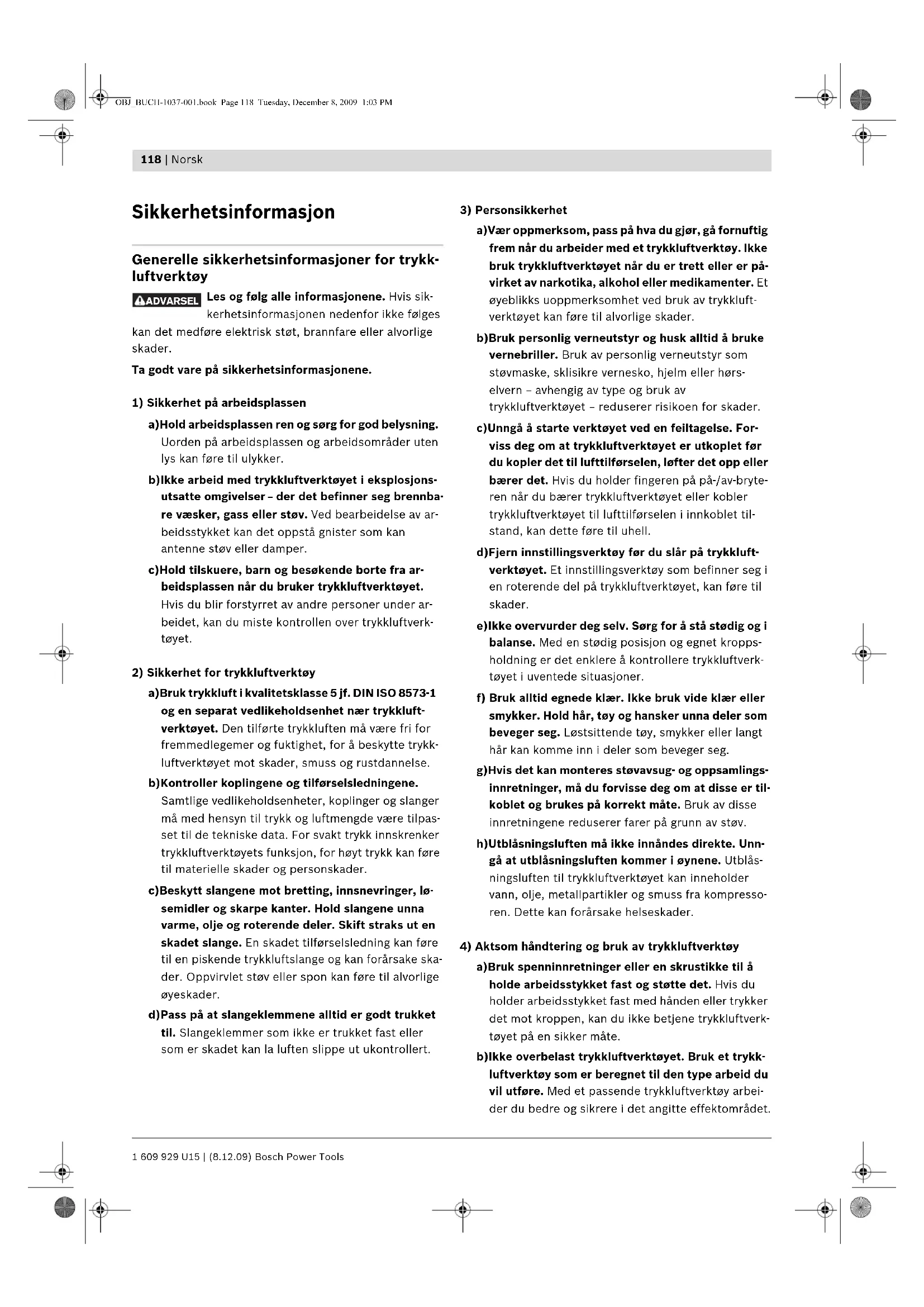 a)Bruk spenninnretninger eller en skrustikke til å holde arbeidsstykket fast og støtte det. Hvis du holder arbeidsstykket fast med hånden eller trykker det mot kroppen, kan du ikke betjene trykkluftverk- tøyet på en sikker måte. b)Ikke overbelast trykkluftverktøyet. Bruk et trykk- luftverktøy som er beregnet til den type arbeid du vil utføre. Med et passende trykkluftverktøy arbei- der du bedre og sikrere i det angitte effektområdet. ADVARSEL OBJ_BUCH-1037-001.book Page 118 Tuesday, December 8, 2009 1:03 PMNorsk | 119 Bosch Power Tools 1 609 929 U15 | (8.12.09) c)Ikke bruk trykkluftverktøy med defekt på-/av-bry- ter. Et trykkluftverktøy som ikke lenger kan slås av eller på, er farlig og må repareres. d)Avbryt lufttilførselen før du utfører innstillinger på verktøyet, skifter tilbehørsdeler eller legger bort trykkluftverktøyet. Dette tiltaket forhindrer at trykkluftverktøyet starter uvilkårlig. e)Trykkluftverktøy som ikke er i bruk må oppbevares utilgjengelig for barn. Ikke la trykkluftverktøyet brukes av personer som ikke er fortrolig med dette eller ikke har lest disse anvisningene. Trykkluft- verktøy er farlige når de brukes av uerfarne perso- ner. f) Vær nøye med vedlikeholdet av trykkluftverktøy- et. Kontroller om bevegelige verktøydeler funge- rer feilfritt og ikke klemmes fast, og om deler er brukket eller skadet, slik at dette innvirker på trykkluftverktøyets funksjon. La skadede deler re- pareres før trykkluftverktøyet brukes. Dårlig vedli- keholdte trykkluftverktøy er årsaken til mange uhell. g)Bruk trykkluftverktøy, tilbehør, innsatsverktøy osv. i samsvar med disse instruksene. Ta hensyn til arbeidsforholdene og arbeidet som skal utføres. Bruk av trykkluftverktøyet til andre formål enn det som er angitt kan føre til farlige situasjoner.