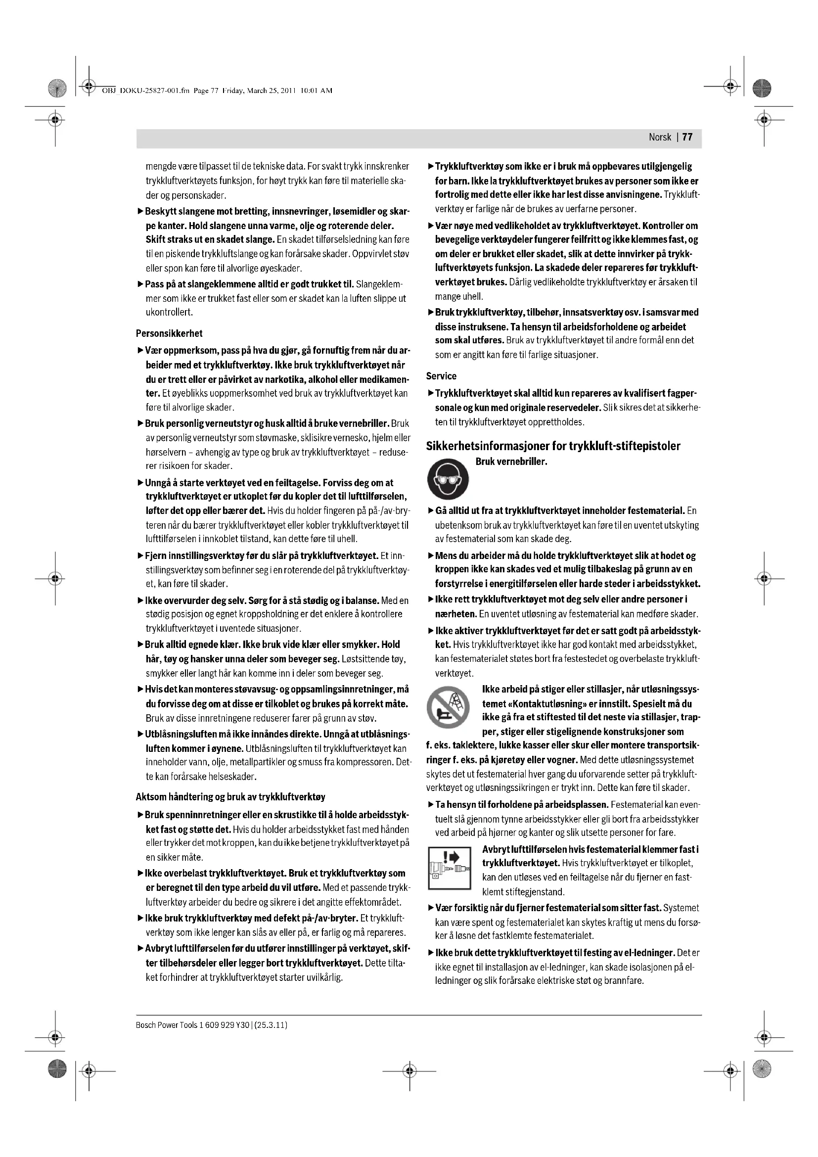 Professional Dr. Egbert Schneider Senior Vice President Engineering Dr. Eckerhard Strötgen Head of Product Certification OBJ_DOKU-25827-001.fm Page 79 Friday, March 25, 2011 10:01 AM1 609 929 Y30 | (25.3.11) Bosch Power Tools 80 | Norsk Pass da på at magasinskyveren er skjøvet over hodet til siste spiker. Merk: Ikke la magasinskyveren smekke uført tilbake. Magasinskyveren kan da skades og det er fare for at fingrene dine klemmes inn. Drift Utløsningssystemer Trykkluftverktøyet kan brukes med to forskjellige utløsningssystemer: – Enkeltutløsning med sikring Med dette utløsningsssystemet må først utløsningssikringen 2 settes godt fast på arbeidsstykket. Festematerialet skytes først ut når utløse- ren 10 trykkes. Senere kan ytterligere innskytinger kun utløses etter at utløseren og ut- løsningssikringen er satt tilbake til utgangsposisjonen. – Kontaktutløsning I dette utløsningssystemet må først utløseren 10 trykkes. Festemateri- al skytes alltid ut når utløsningssikringen 2 med trykt utløser settes godt på arbeidsstykket. Slik oppnås en høyere arbeidshastighet. Til innstilling av utløsningssystemet bruker du omkoplingsbryteren 9. Igangsetting Avbryt lufttilførselen før du utfører innstillinger på verktøyet, skifter tilbehørsdeler eller legger bort trykkluftverktøyet. Dette tiltaket forhindrer at trykkluft- verktøyet starter uvilkårlig. Arbeid med enkeltutløsning (se bilde C) – Trykk omkoplingsbryteren 9 innover og vipp den samtidig til nedre stil- ling, til den smekker i lås igjen. Utløsningssystemet «Enkeltutløsning» er inn- stilt. – Slipp deretter omkoplingsbryteren 9 igjen. – Sett munningen 11 eller eventuelt den gummi-besjiktede arbeidsstyk- kebeskyttelsen 1 godt på arbeidsstykket til utløsningssikringen 2 er trykt helt inn. – Trykk deretter kort på utløseren 10 og slipp den igjen. Det skytes da ut en spiker. – La trykkluftverktøyet støte tilbake fra arbeidsstykket. – Til en ytterligere innskyting løfter du trykkluftverktøyet helt opp fra ar- beidsstykket og setter det godt på på det neste ønskede stedet. Arbeid med kontaktutløsning (se bilde D) – Trykk omkoplingsbryteren 9 innover og vipp den samtidig til øvre stil- ling, til den smekker i lås igjen. Utløsningssystemet «Kontaktutløsning» er innstilt. – Slipp deretter omkoplingsbryteren 9 igjen. – Deretter trykker du på utløseren 10 og holder den trykt inne. – Sett munningen 11 eller eventuelt den gummi-besjiktede arbeidsstyk- kebeskyttelsen 1 godt på arbeidsstykket til utløsningssikringen 2 er trykt helt inn. Det skytes da ut en spiker. – La trykkluftverktøyet støte tilbake fra arbeidsstykket. – Til en ytterligere innskyting løfter du trykkluftverktøyet helt opp fra ar- beidsstykket og setter det godt på på det neste ønskede stedet. – Beveg trykkluftverktøyet jevnt over arbeidsstykket ved å løfte det opp og sette det på igjen. Hver gang du setter på trykkluftverktøyet og utløsningssikringen er trykt inn, skytes en spiker ut. – Når ønsket antall spikere er skytt inn, slipper du utløseren 10 igjen. Arbeidshenvisninger Avbryt lufttilførselen før du utfører innstillinger på verktøyet, skifter tilbehørsdeler eller legger bort trykkluftverktøyet. Dette tiltaket forhindrer at trykkluft- verktøyet starter uvilkårlig. Før hver arbeidsstart må du sjekke om alle sikkerhets- og utløsningsinn- retningene fungerer feilfritt og om alle skruene og mutrene sitter godt fast. Adskill et defekt eller ikke feilfritt trykkluftverktøy straks fra lufttilførselen og ta kontakt med en autorisert Bosch-kundeservice. Utfør ikke uforskriftsmessige manipulasjoner på trykkluftverktøyet. Ikke demonter eller blokker deler av trykkluftverktøyet, som f.eks. utløsnings- sikringen. Utfør ingen «nødreparasjoner» med uegnede midler. Trykkluftverktøyet skal vedlikeholdes sakkyndig og med jevne mellomrom (se «Vedlikehold og rengjøring», side 81). Unngå enhver svekking og skading av trykkluftverktøyet, f.eks. med: – innslåing eller inngravering, – konstruksjonsendringer som ikke er tillatt av produsenten, – føring langs sjabloner av hardt material, f.eks. stål, – falling på eller skyving over gulv, –bruk som hammer, – enhver type vold. Finn ut hva som befinner seg under eller bak arbeidsstykket. Ikke skyt spi- kre inn i vegger, tak eller gulv, hvis det befinner seg personer bak. Spiker- ne kan slå gjennom arbeidsstykket og skade noen. Ikke skyt en spiker inn på en allerede innskutt spiker. Spikeren kan defor- meres, klemmes fast eller trykkluftverktøyet kan bevege seg ukontrollert. Hvis trykkluftverktøyet brukes i kulde, skytes de første spikerne langsom- mere inn enn vanlig. Når trykkluftverktøyet er blitt varmere i løpet av ar- beidet, er en normal arbeidshastighet mulig igjen. Unngå tomskudd for å redusere slitasjen på slagstempelet. Adskill trykkluftverktøyet fra lufttilførselen i lengre arbeidspauser og når arbeidet er ferdig og tøm helst magasinet. Tømming av magasinet – Trekk magasinskyveren 7 så langt tilbake at den smekker i lås bak. – Ta ut båndet spiker 14. Bruk ikke båndet spiker med mindre enn 5 spikere. – Trekk magasinskyveren 7 helt tilbake en gang til for å løse arreteringen. – Før magasinskyveren forsiktig fremover til den berører begynnelsen på magasinet. Merk: Ikke la magasinskyveren smekke uført tilbake. Magasinskyveren kan da skades og det er fare for at fingrene dine klemmes inn. Innstilling av dybdeanlegget (se bilde E) Innskytingsdybden til spikerne kan innstilles med stillhjulet 3. –Tøm magasinet 8. (se «Tømming av magasinet», side 80) – Spikerne skytes for dypt inn: Til reduksjon av innskytingsdybden dreier du stillhjulet 3 mot klokken. eller OBJ_DOKU-25827-001.fm Page 80 Friday, March 25, 2011 10:01 AMNorsk | 81 Bosch Power Tools 1 609 929 Y30 | (25.3.11) Spikerne skytes ikke dypt nok inn: Til øking av innskytingsdybden dreier du stillhjulet 3 mot 