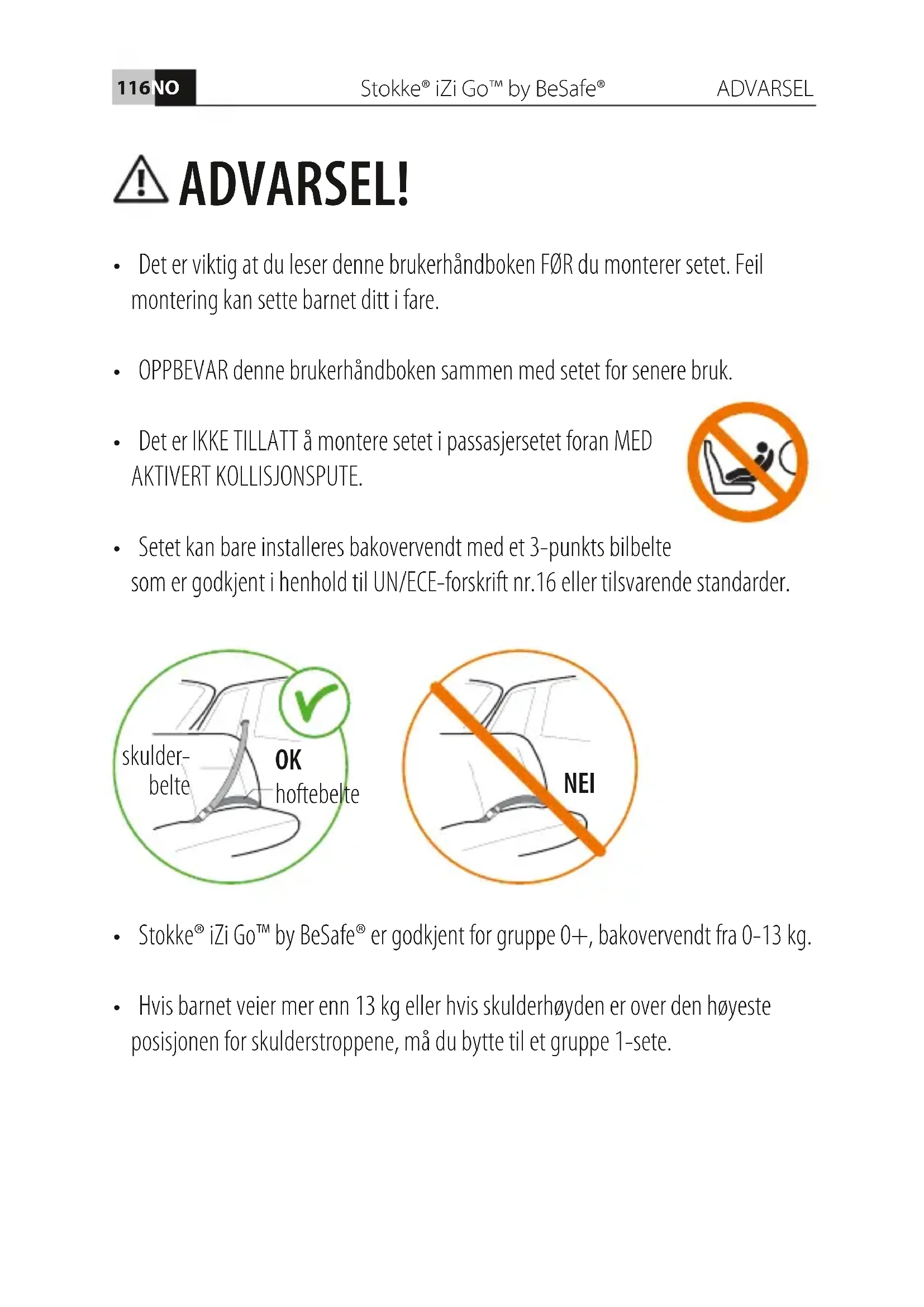 User instruction. Play movie.Stokke® iZi Go™ by BeSafe® 116 NO ADVARSEL