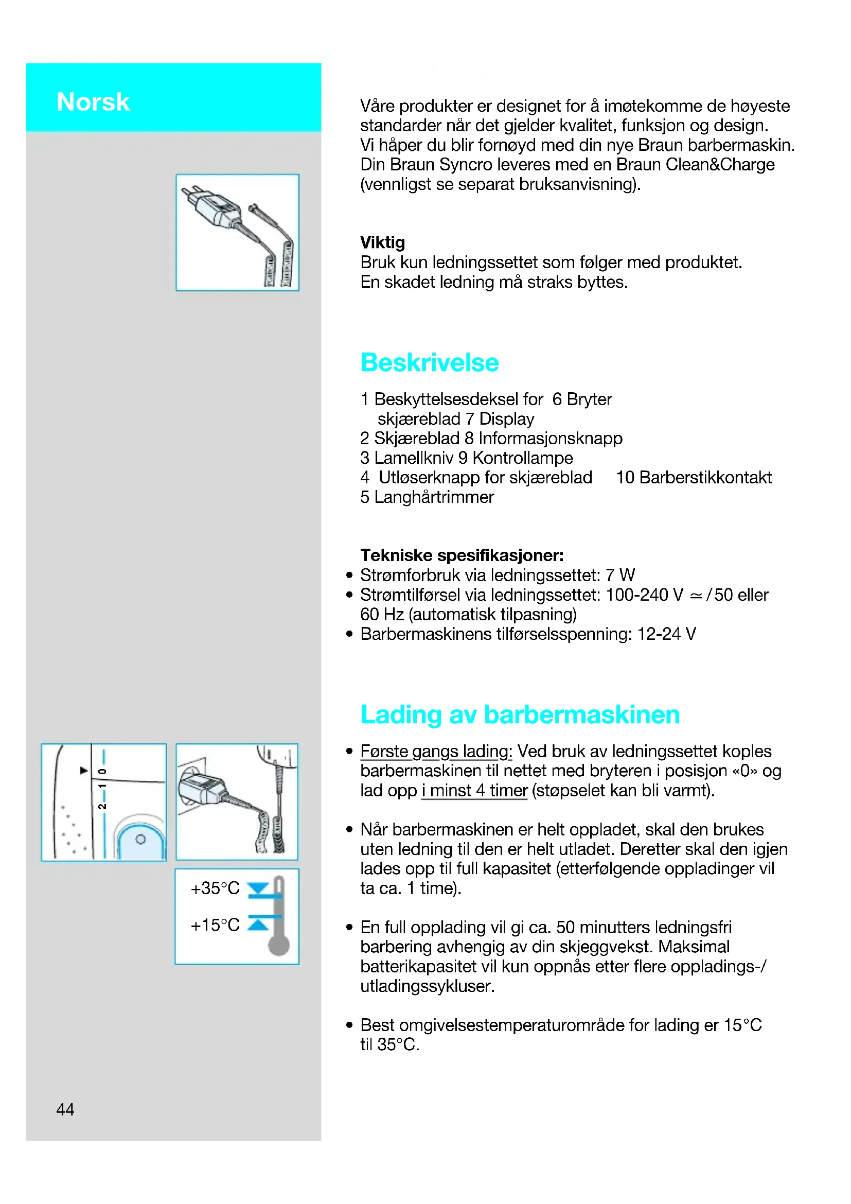 5491458_S 4-78 Seite 43 Freitag, 7. April 2000 9:37 0944 Våre produkter er designet for å imøtekomme de høyeste standarder når det gjelder kvalitet, funksjon og design. Vi håper du blir fornøyd med din nye Braun barbermaskin. Din Braun Syncro leveres med en Braun Clean&Charge (vennligst se separat bruksanvisning). Viktig Bruk kun ledningssettet som følger med produktet. En skadet ledning må straks byttes. Beskrivelse 1 Beskyttelsesdeksel for 6 Bryter skjæreblad 7 Display 2 Skjæreblad 8 Informasjonsknapp 3 Lamellkniv 9 Kontrollampe 4 Utløserknapp for skjæreblad 10 Barberstikkontakt 5 Langhårtrimmer Tekniske spesifikasjoner: