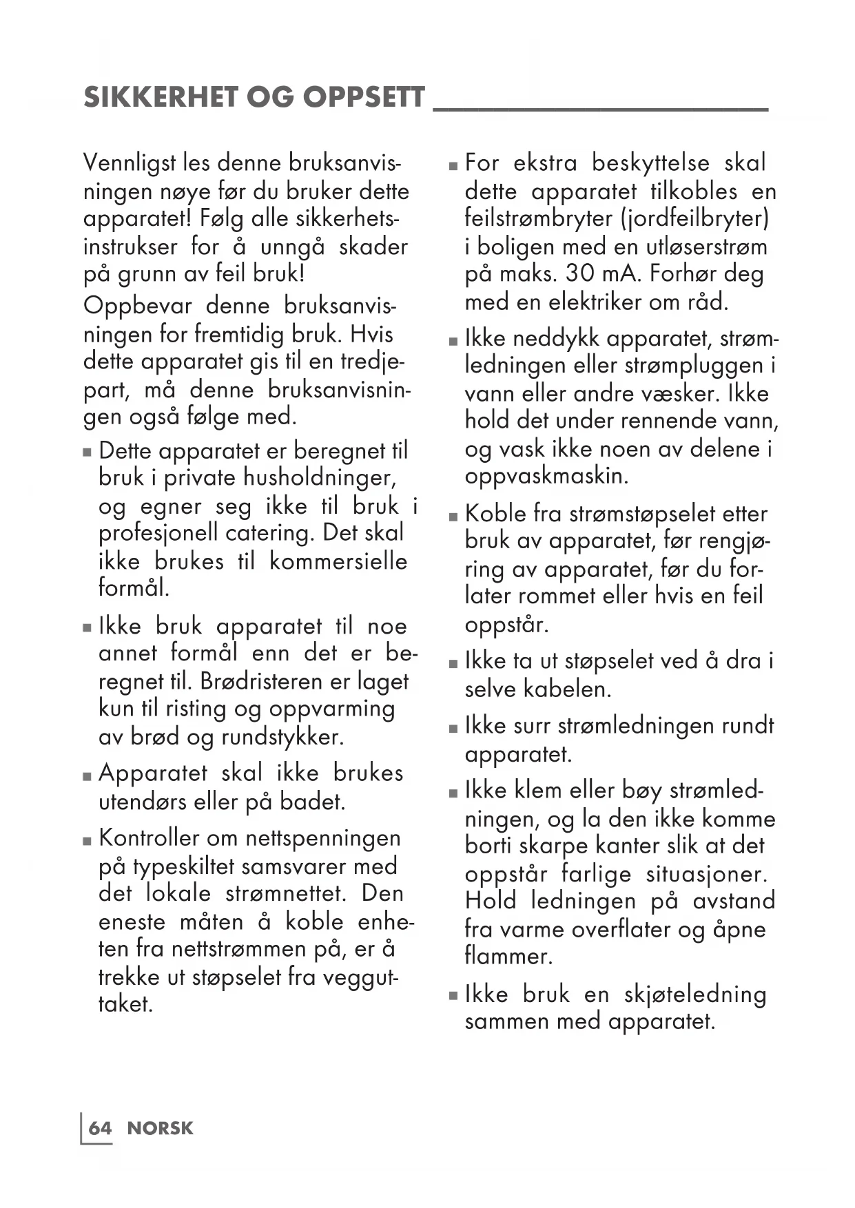 Ikke bruk apparatet til noe annet formål enn det er be- regnet til. Brødristeren er laget kun til risting og oppvarming av brød og rundstykker.