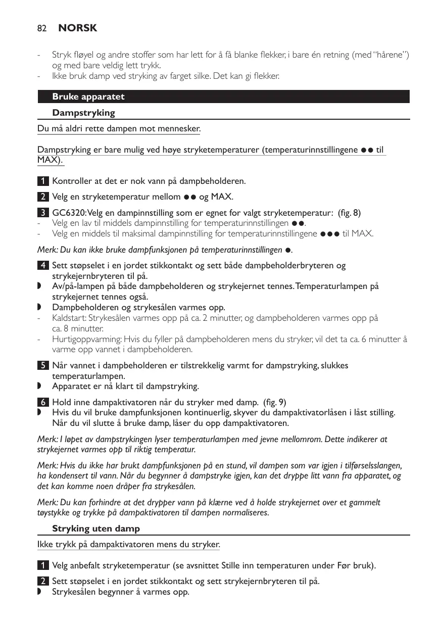 Norsk Stryk fløyel og andre stoffer som har lett for å få blanke flekker, i bare én retning (med “hårene”) og med bare veldig lett trykk. Ikke bruk damp ved stryking av farget silke. Det kan gi flekker. Bruke apparatet Dampstryking Du må aldri rette dampen mot mennesker. Dampstryking er bare mulig ved høye stryketemperaturer (temperaturinnstillingene 2 til MAX). 1 Kontroller at det er nok vann på dampbeholderen. 2 Velg en stryketemperatur mellom 2 og MAX. 3 GC6320:Velg en dampinnstilling som er egnet for valgt stryketemperatur: (fig. 8) - Velg en lav til middels dampinnstilling for temperaturinnstillingen 2. - Velg en middels til maksimal dampinnstilling for temperaturinnstillingene 3 til MAX. Merk: Du kan ikke bruke dampfunksjonen på temperaturinnstillingen 1. 4 Sett støpselet i en jordet stikkontakt og sett både dampbeholderbryteren og strykejernbryteren til på. , Av/på-lampen på både dampbeholderen og strykejernet tennes. Temperaturlampen på strykejernet tennes også. , Dampbeholderen og strykesålen varmes opp. - Kaldstart: Strykesålen varmes opp på ca. 2 minutter, og dampbeholderen varmes opp på ca. 8 minutter. - Hurtigoppvarming: Hvis du fyller på dampbeholderen mens du stryker, vil det ta ca. 6 minutter å varme opp vannet i dampbeholderen. 5 Når vannet i dampbeholderen er tilstrekkelig varmt for dampstryking, slukkes temperaturlampen. , Apparatet er nå klart til dampstryking. 6 Hold inne dampaktivatoren når du stryker med damp. (fig. 9) , Hvis du vil bruke dampfunksjonen kontinuerlig, skyver du dampaktivatorlåsen i låst stilling. Når du vil slutte å bruke damp, låser du opp dampaktivatoren. Merk: I løpet av dampstrykingen lyser temperaturlampen med jevne mellomrom. Dette indikerer at strykejernet varmes opp til riktig temperatur. Merk: Hvis du ikke har brukt dampfunksjonen på en stund, vil dampen som var igjen i tilførselsslangen, ha kondensert til vann. Når du begynner å dampstryke igjen, kan det dryppe litt vann fra apparatet, og det kan komme noen dråper fra strykesålen. Merk: Du kan forhindre at det drypper vann på klærne ved å holde strykejernet over et gammelt tøystykke og trykke på dampaktivatoren til dampen normaliseres. Stryking uten damp Ikke trykk på dampaktivatoren mens du stryker. 1 Velg anbefalt stryketemperatur (se avsnittet Stille inn temperaturen under Før bruk). 2 Sett støpselet i en jordet stikkontakt og sett strykejernbryteren til på. , Strykesålen begynner å varmes opp. Norsk 83 3 Stryk uten å trykke på dampaktivatoren. , Hvis du trykker på dampaktivatoren ved et uhell mens du stryker, vil det komme ut litt damp. Du kan unngå dette ved å sette dampbeholderbryteren til av for å kutte dampen helt. , Hvis dampbeholderen er tom eller ikke er varmet opp, vil du høre en klikkelyd fra den. Dette skjer når dampventilen åpnes, og det er helt ufarlig. Etter stryking 1 Sett strykejernbryteren til på, og dampbeholderbryteren til av. (fig. 4) 2 Trykk på dampaktivatoren til du ikke lenger hører at det kommer damp fra apparatet (fig. 10). Dampbeholderen er nå uten trykk. 3 Ta ut støpselet av stikkontakten. 4 Plasser strykejernet på strykejernstativet og la apparatet avkjøles før du begynner å rengjøre det. Funksjoner Vertikal dampstryking Du må aldri rette dampen mot mennesker.