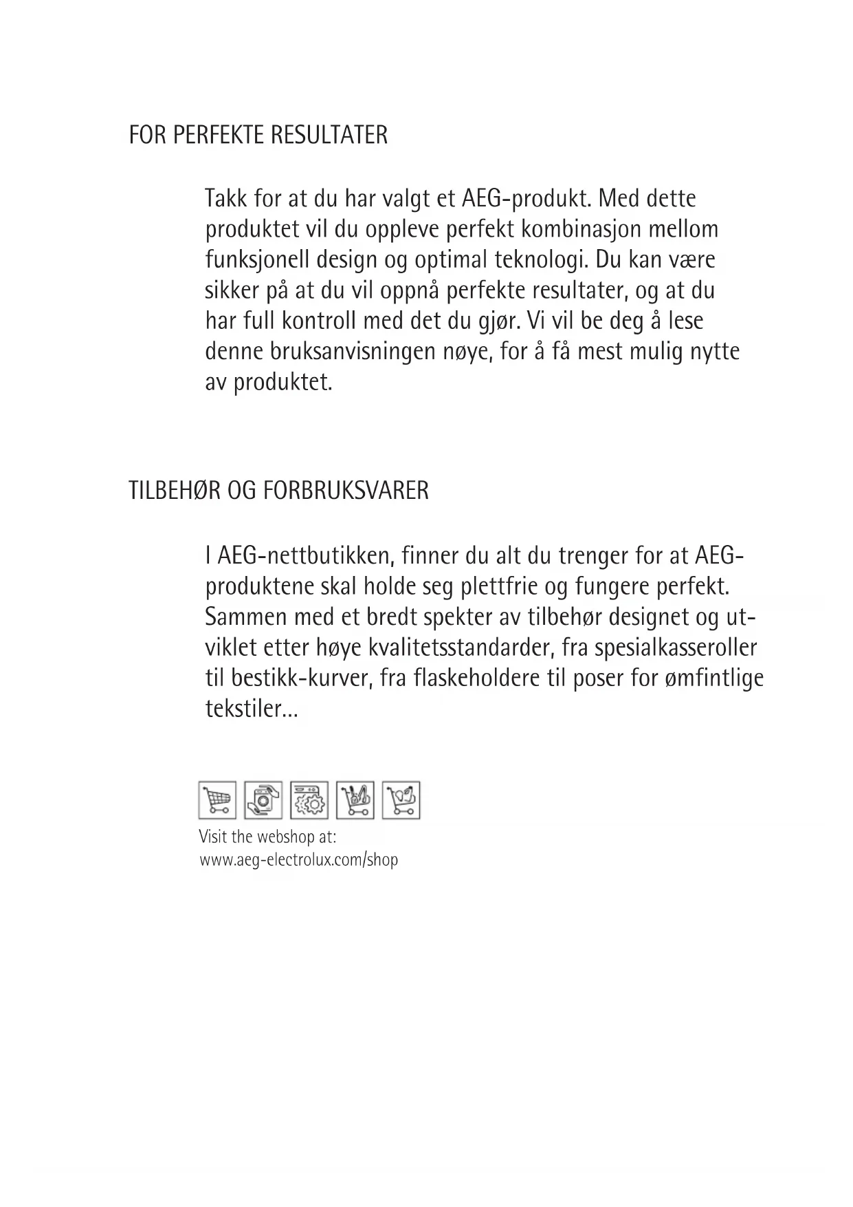 I AEG-nettbutikken, finner du alt du trenger for at AEG- produktene skal holde seg plettfrie og fungere perfekt. Sammen med et bredt spekter av tilbehør designet og ut- viklet etter høye kvalitetsstandarder, fra spesialkasseroller til bestikk-kurver, fra flaskeholdere til poser for ømfintlige tekstiler… Visit the webshop at: www.aeg-electrolux.com/shopNO - RÅD OG FORSLAG