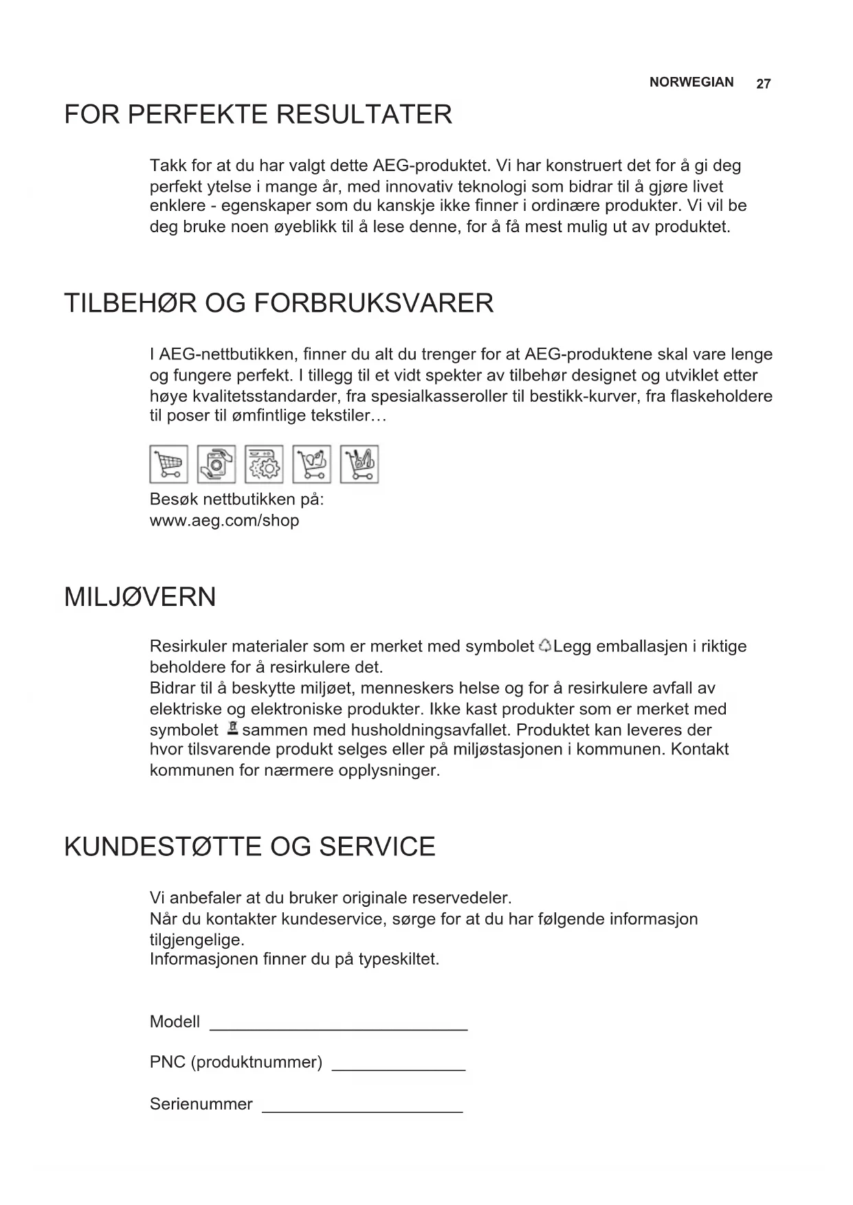 I AEG-nettbutikken, nner du alt du trenger for at AEG-produktene skal vare lenge og fungere perfekt. I tillegg til et vidt spekter av tilbehør designet og utviklet etter høye kvalitetsstandarder, fra spesialkasseroller til bestikk-kurver, fra askeholdere til poser til ømntlige tekstiler… Besøk nettbutikken på: www.aeg.com/shop MILJØVERN Resirkuler materialer som er merket med symbolet . Legg emballasjen i riktige beholdere for å resirkulere det. Bidrar til å beskytte miljøet, menneskers helse og for å resirkulere avfall av elektriske og elektroniske produkter. Ikke kast produkter som er merket med symbolet sammen med husholdningsavfallet. Produktet kan leveres der hvor tilsvarende produkt selges eller på miljøstasjonen i kommunen. Kontakt kommunen for nærmere opplysninger.