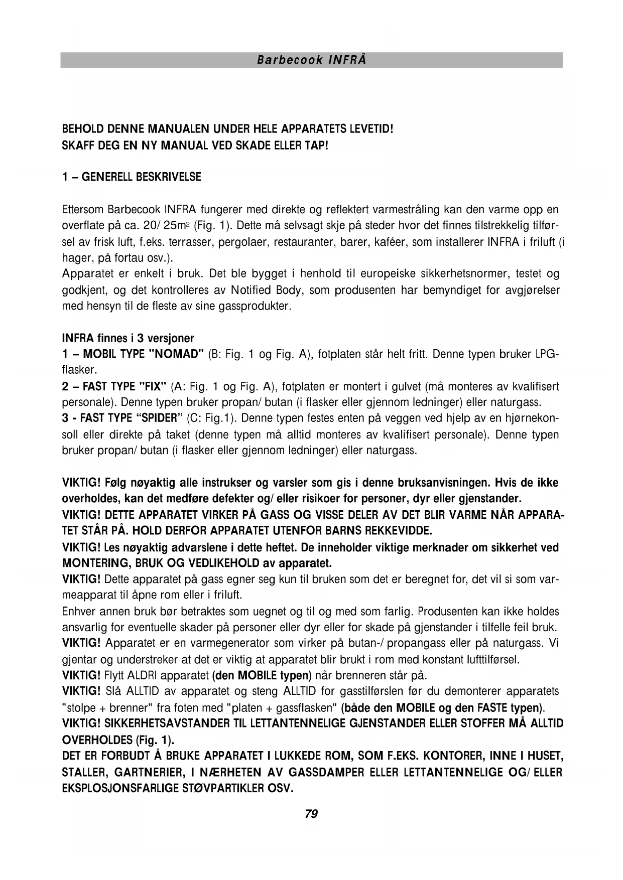 VIKTIG! Dette apparatet på gass egner seg kun til bruken som det er beregnet for, det vil si som varmeapparat til Åpne rom ell er i friluft.
