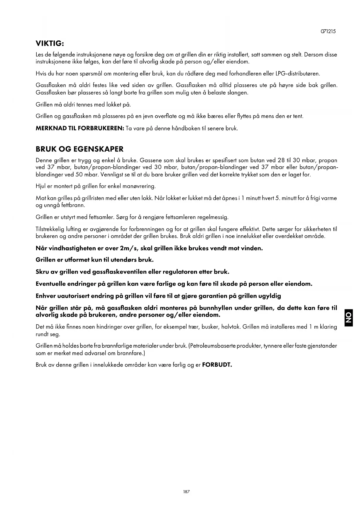 Denne grillen er trygg og enkel å bruke. Gassene som skal brukes er spesifisert som butan ved 28 til 30 mbar, propan ved 37 mbar, butan/propan-blandinger ved 30 mbar, butan/propan-blandinger ved 37 mbar eller butan/propan- blandinger ved 50 mbar. Vennligst se til at du bare bruker grillen ved det korrekte trykket som den er laget for. Hjul er montert på grillen for enkel manøvrering. Mat kan grilles på grillristen med eller uten lokk. Når lokket er lukket må det åpnes i 1 minutt hvert 5. minutt for å frigi varme og unngå fettbrann. Grillen er utstyrt med fettsamler. Sørg for å rengjøre fettsamleren regelmessig. Tilstrekkelig lufting er avgjørende for forbrenningen og for at grillen skal fungere effektivt. Dette sørger for sikkerheten til brukeren og andre personer i området der grillen brukes. Bruk aldri grillen i noe innelukket eller overdekket område. Når vindhastigheten er over 2m/s, skal grillen ikke brukes vendt mot vinden. Grillen er utformet kun til utendørs bruk. Skru av grillen ved gassflaskeventilen eller regulatoren etter bruk. Eventuelle endringer på grillen kan være farlige og kan føre til skade på person eller eiendom. Enhver uautorisert endring på grillen vil føre til at gjøre garantien på grillen ugyldig Når grillen står på, må gassflasken aldri monteres på bunnhyllen under grillen, da dette kan føre til alvorlig skade på brukeren, andre personer og/eller eiendom. Det må ikke finnes noen hindringer over grillen, for eksempel trær, busker, halvtak. Grillen må installeres med 1 m klaring rundt seg. Grillen må holdes borte fra brannfarlige materialer under bruk. (Petroleumsbaserte produkter, tynnere eller faste gjenstander som er merket med advarsel om brannfare.) Bruk av denne grillen i innelukkede områder kan være farlig og er FORBUDT. NO188