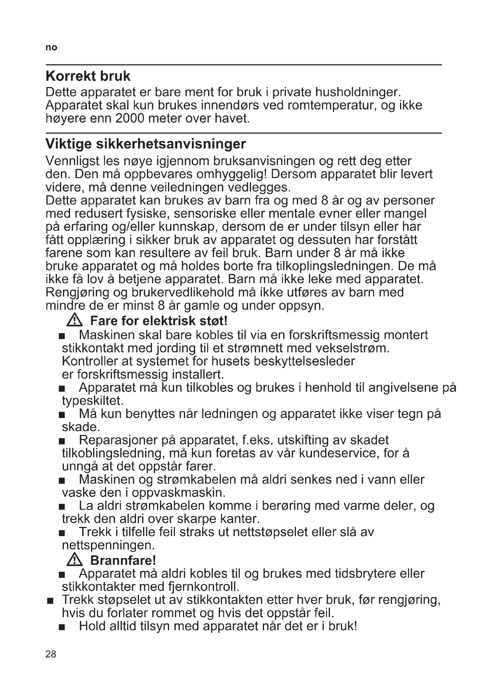 Dette apparatet kan brukes av barn fra og med 8 ar og av personer med redusert fysiske, sensoriske eller mentale evner uller mangel på erfaring og/eller kunnskap, dersom de er under tilsyn uller har fatt opplæring i sikkerBruk av apparatet og dessuten har forstatt farene som kan resultere av feilBruk. Barn under 8 ar mA不同程度 bruke apparatet og ma holdes borte fra tilkoplingsledningen. De ma akne fá lov a betjene apparatet. Barn mA不同程度 me med apparatet. Rengjøring og brukervedlikehold mA不同程度 av barn med mindre de er minst 8 ar gamle og under oppsyn.