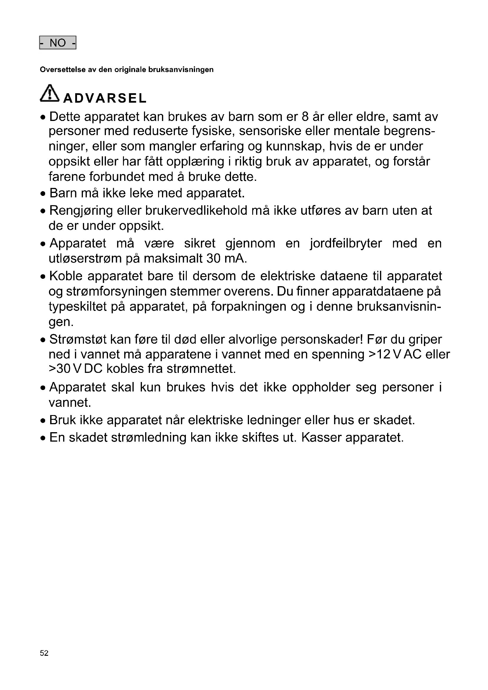 Lagring/overvintring Ved frost må apparatet demonteres. Gjennomfør en grundig rengjøring, kontroller om apparatet har noen skader, og oppbevar det nedsenket i eller fylt med vann, og frostfritt. Pluggen må ikke nedsenkes i vannet!