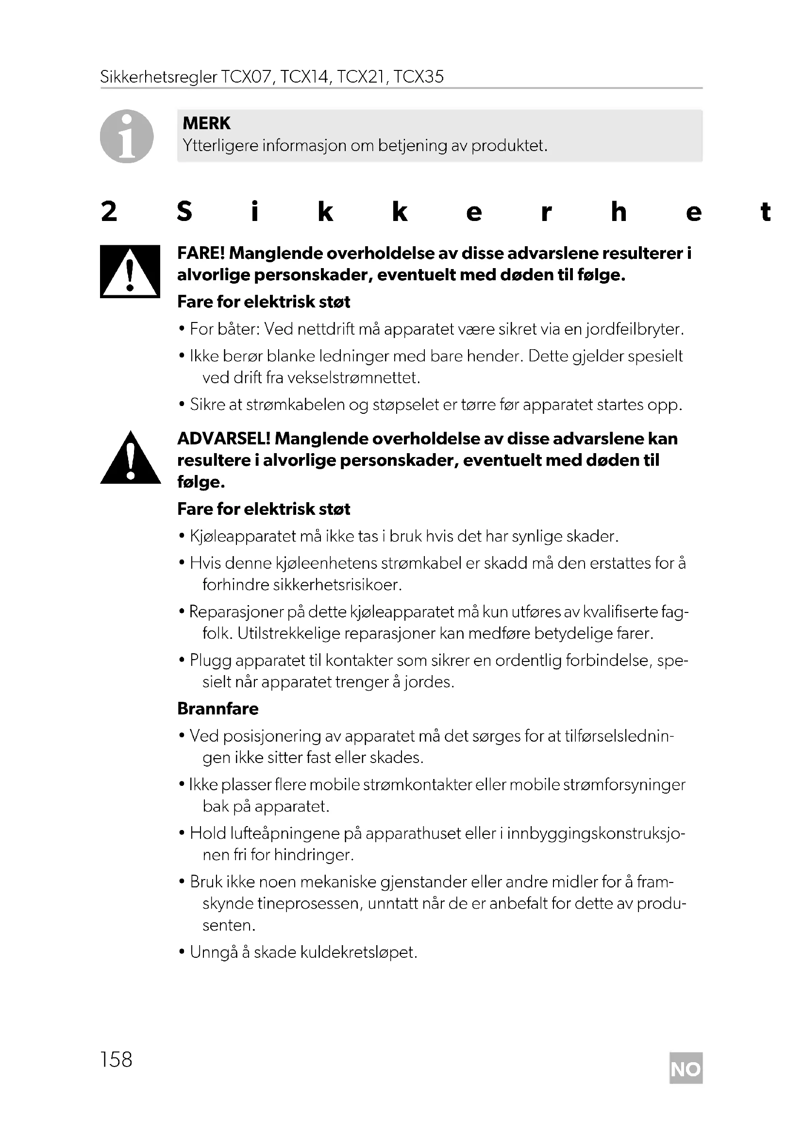 - Hvis enheten blir værende tom over lengre tid: – Slå av apparatet. – Avrim apparatet. – Rengjør og tørk apparatet. – La lokket være åpent for å unngå muggdannelse inne i apparatet. DometicTCX07-TCX35_OPM_4445103171_EMEA16-ar_202x-xx-xx.book Page 159 Tuesday, November 29, 2022 11:33 AMNO Sikkerhetsregler TCX07, TCX14, TCX21, TCX35