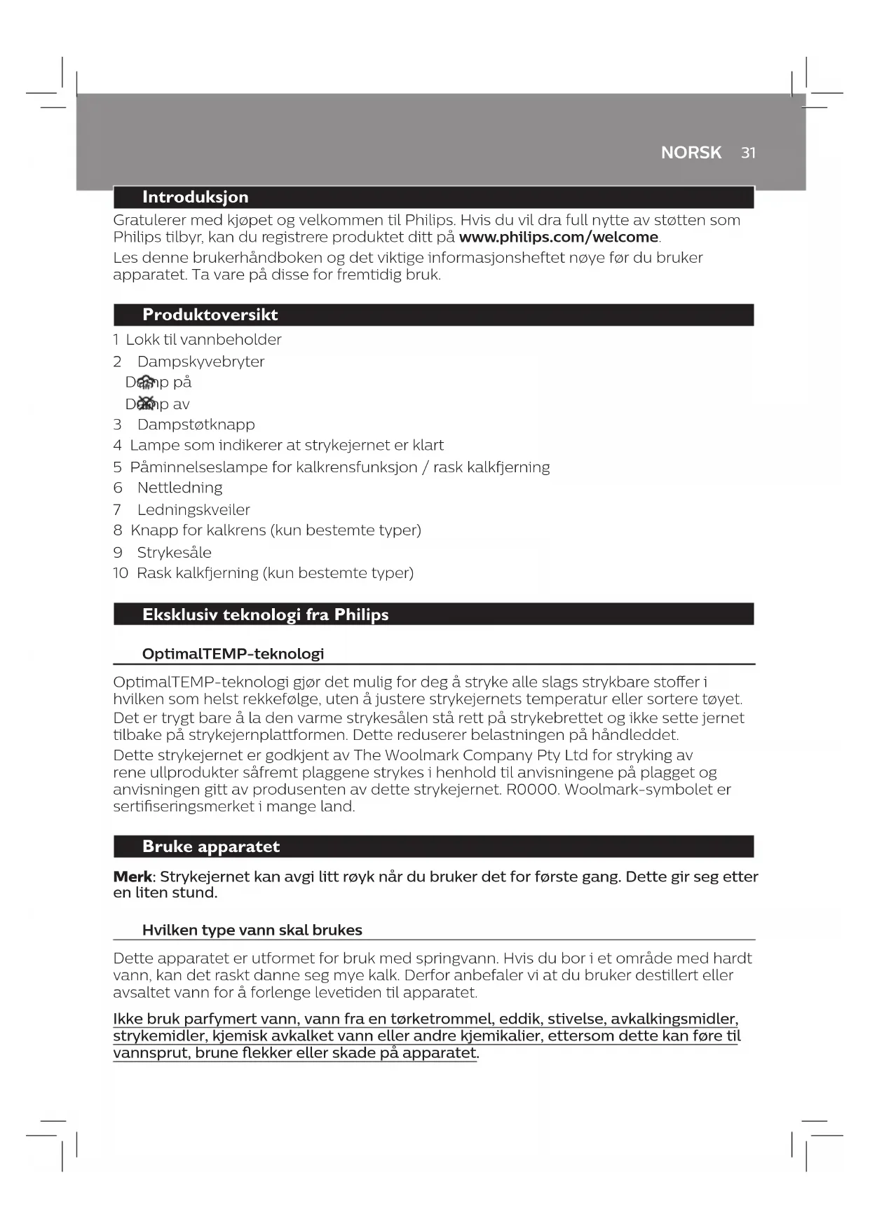 3 Vipp opp hendelen til oppsamleren for rask kalkfjerning (g. 2-4), og trekk ut oppsamleren (g. 2-5). 4 Rengjør oppsamleren for rask kalkfjerning med vann (g. 2-6, g. 2-7). 5 Rist apparatet forsiktig slik at kalkpartikler faller ut (g. 2-8). 6 Sett oppsamleren for rask kalkfjerning tilbake i apparatet (g. 2-10). 7 Trykk ned hendelen (du hører et klikk) for å låse oppsamleren (g. 2–11). Kalkrensfunksjon (kun bestemte typer) VIKTIG: Etter én til tre måneders bruk vil påminnelseslampen for kalkrensfunksjonen begynne å blinke. Dette indikerer at du må bruke kalkrensfunksjonen (g. 3-1). Dette er for å fjerne kalkbelegg i strykejernet for å forlenge levetiden til apparatet. Tips: Kalkrensfunksjonen kan brukes når som helst, selv når påminnelseslampen ikke er aktivert. Hvis du bor i et område med hardt vann, kan du bruke funksjonen oftere. 1 Kontroller at dampskyvebryteren er satt til "damp av"-posisjonen (g. 3-2). 2 Pass på at det er nok vann (mer enn 3/4) i vannbeholderen. Hvis det ikke er nok vann, trekker du ut støpselet til strykejernet, fyller vann til MAX-merket (g. 3-3), og kobler til strykejernet igjen (g.3-4). Ikke hell eddik eller andre avkalkingsmidler i vannbeholderen. 3 Vent på at strykejernet varmes opp. Dette tar rundt to minutter (g. 3-5). Merk: Påminnelseslampen for kalkrensfunksjonen slås av under oppvarming. . 4 Trekk ut støpselet til strykejernet når lampen som indikerer at strykejernet er klart, slutter å pulsere (g. 3-7). 5 Hold strykejernet over vasken. Trykk gjentatte ganger på knappen for kalkrens, og rist strykejernet forsiktig frem og tilbake til alt vannet i beholderen er brukt opp (g. 3-8). Mens kalkrester skylles ut, kommer også damp og kokende vann ut av strykesålen. Merk: Gjenta trinn 2 til 5 hvis vannet som kommer ut av apparatet, fremdeles har spor av kalk. 6 Koble til apparatet, og la det varmes opp for å tørke strykesålen. Dette tar rundt to minutter (g. 3-9). 7 Koble fra apparatet (g. 3-10). Beveg apparatet forsiktig over et tøystykke for å fjerne vannekker på strykesålen (g. 3-11). Feilsøking Dette avsnittet gir en oppsummering av de vanligste problemene som kan oppstå med apparatet. Hvis du ikke kan løse problemet ved hjelp av informasjonen nedenfor, kan du gå til www.philips.com/support for å se en liste over vanlige spørsmål, eller du kan kontakte forbrukerstøtten i landet der du bor.NORSK