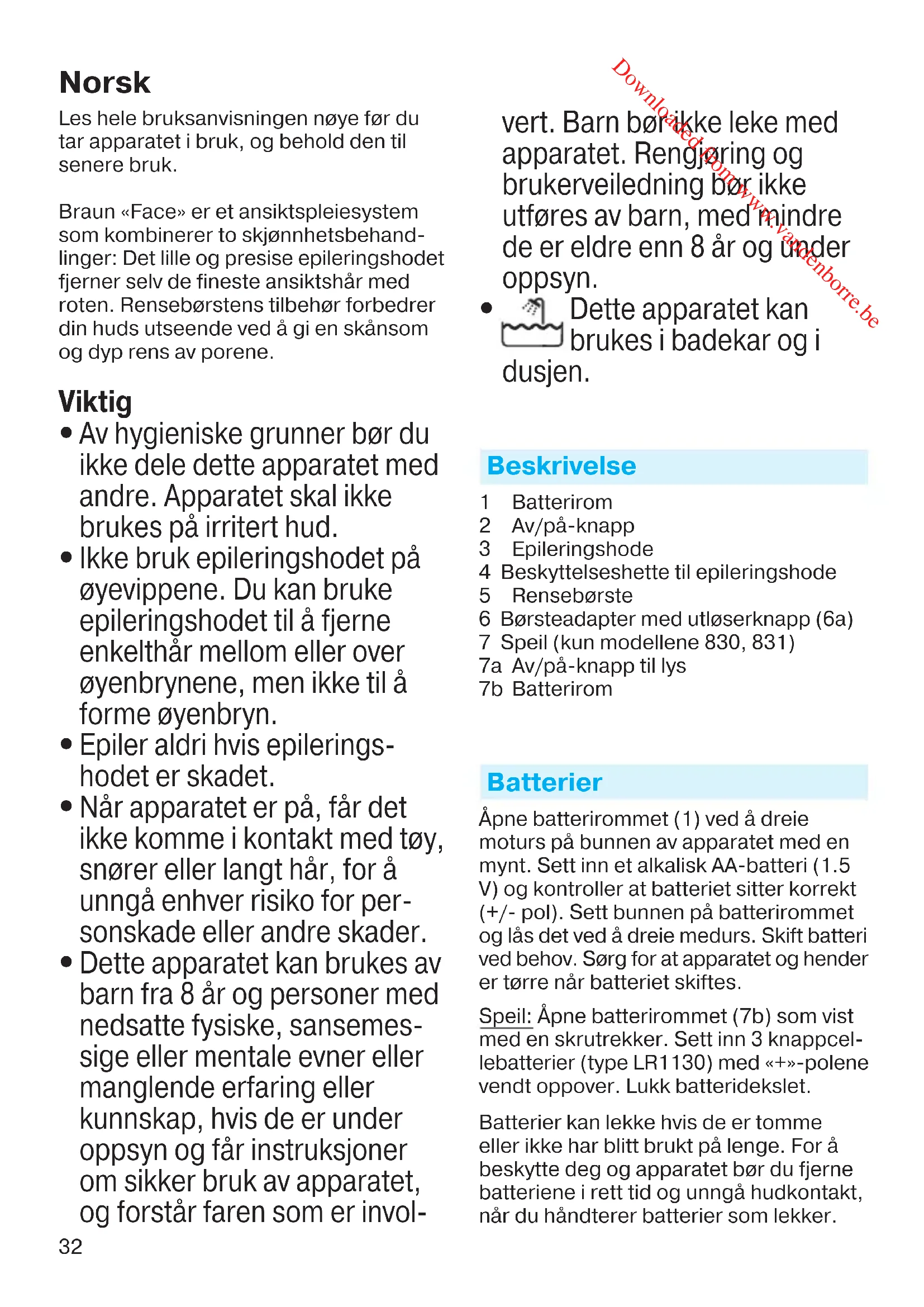 Dette apparatet kan brukes i badekar og i dusjen. Beskrivelse 1 Batterirom 2 Av/på-knapp 3 Epileringshode 4 Beskyttelseshette til epileringshode 5 Rensebørste 6 Børsteadapter med utløserknapp (6a) 7 Speil (kun modellene 830, 831) 7a Av/på-knapp til lys 7b Batterirom Batterier Åpne batterirommet (1) ved å dreie moturs på bunnen av apparatet med en mynt. Sett inn et alkalisk AA-batteri (1.5
