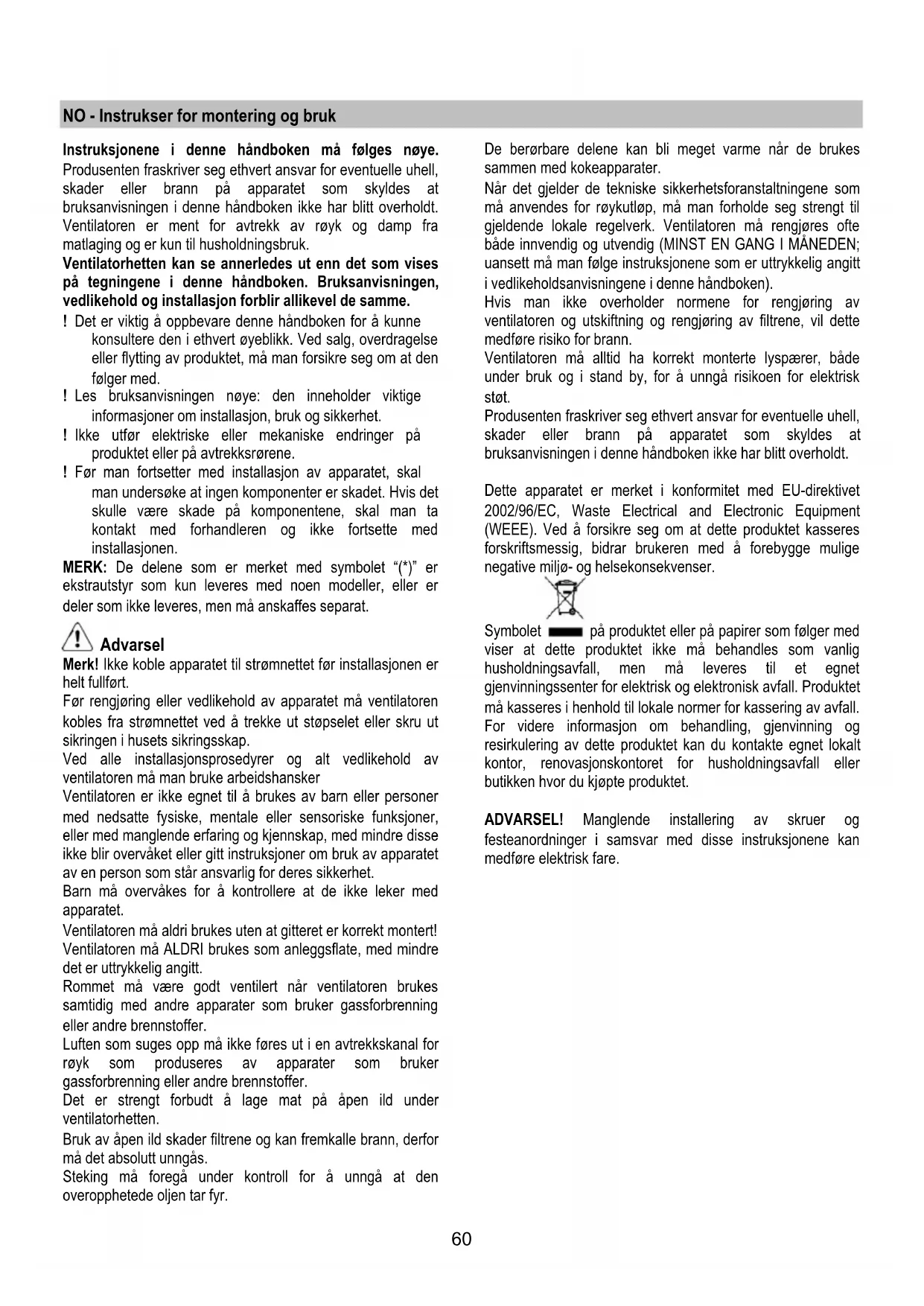 Elektrisk tilslutning Nettspenningen må være i samsvar med den elektriske spenningen som angis på typeskiltet inne i ventilatoren. Hvis det følger med støpsel, kobles ventilatoren til en lett tilgjengelig stikkontakt som er godkjent i henhold til gjeldende normer. Stikkontakten må være lett tilgjengelig også etter installasjonen. Hvis det ikke følger med støpsel (direkte kobling til strømnettet), eller stikkontakten selv etter installasjonen ikke er lett tilgjengelig, må man sette på en godkjent topolet bryter som garanterer fullstendig frakobling fra strømnettet i situasjonene som oppstår i kategorien overspenning III, i henhold til installasjonsreglene. Merk! Før man kobler ventilatorens strømkrets til strømnettet og fastslår at alt fungerer korrekt, må man alltid kontrollere at strømledningen er korrekt montert. Ventilatoren har en spesiell strømledning; dersom denne skades, skal man henvende seg til kundeassistansen for kjøp av en ny. Montering Denne typen avtrekk skal festes i taket. Dette produktet er svært tungt. Flytting og installasjon av kjøkkenventilatoren må derfor utføres av to eller flere personer. Før installasjonen: