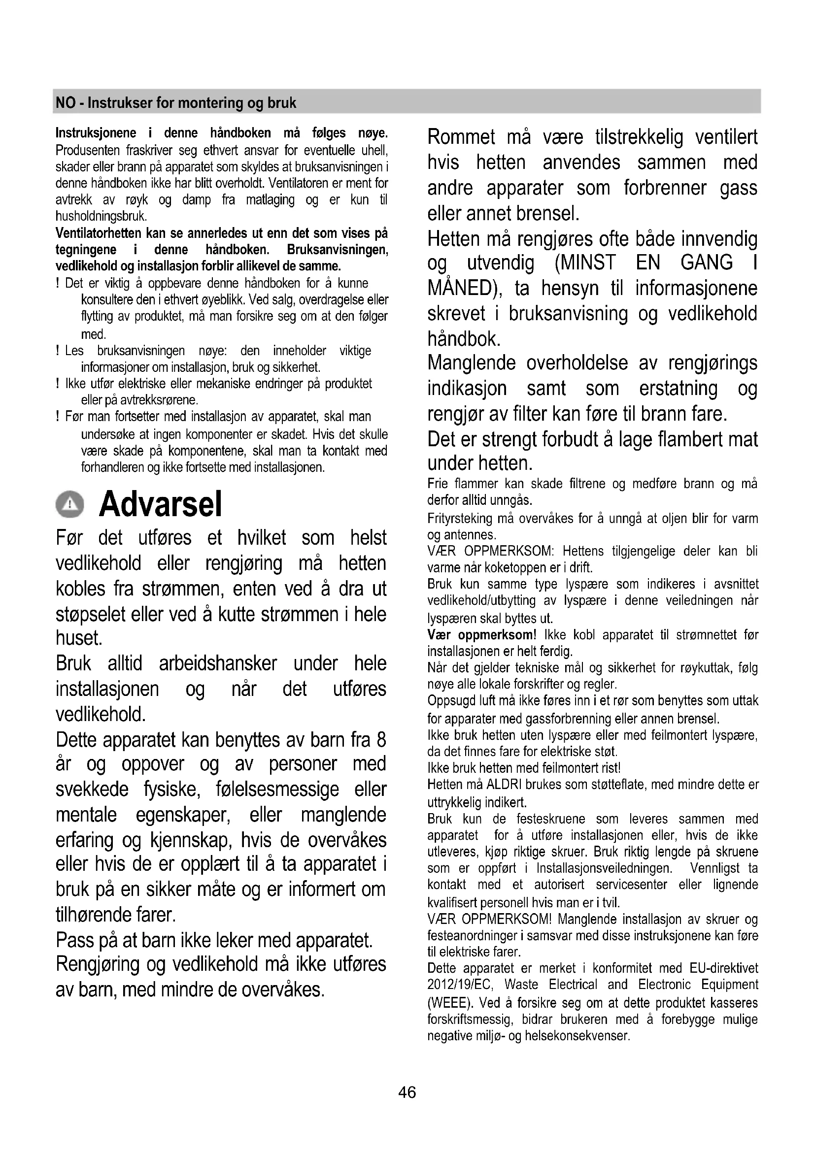 - Elektromagnetisk kompatibilitet EMC: EN 55014-1; CISPR 14-1; EN 55014-2; CISPR 14-2; EN/IEC 61000-3-2; EN/IEC 61000-3-3. Forslag til riktig bruk for å redusere miljøpåvirkning: Skru PÅ ventilatorhetten på minimum hastighet når du starter matlagingen og lå den holdes i gang i noen minutter etter at matlagingen er ferdig. Øk hastigheten kun ved store mengder røyk og damp og bruk boost-hastighet(er) kun i ekstreme situasjoner. Skift ut kullfilter når det er nødvendig for å opprettholde optimal effektivitet for odørreduksjon. Rengjør fettfilter når det er nødvendig for å opprettholde optimal effektivitet for fettfilter. Bruk maksimum diameter på kanalsystemet som er angitt i denne bruksanvisningen for å optimalisere effektivitet og minimere støy. Bruksmåte Ventilatoren er ment for avtrekk av røyk og damp fra matlaging og er kun til husholdningsbruk. Ventilatorhetten er laget for å brukes i filtrerende funksjon med indre resirkulering. Røyk og damp fra matlaging blir sugd opp av ventilatoren, filtrert og renset ved at de blåses ut gjennom fettfilteret / - filtrene og karbonfilteret / -filtrene som ventilatoren MÅ være utstyrt med. Når man installerer kjøkkenhetten med direkte avtrekk, er det nødvendig å fjerne gitteret for luftutløp, som er festet som på Fig.8.
