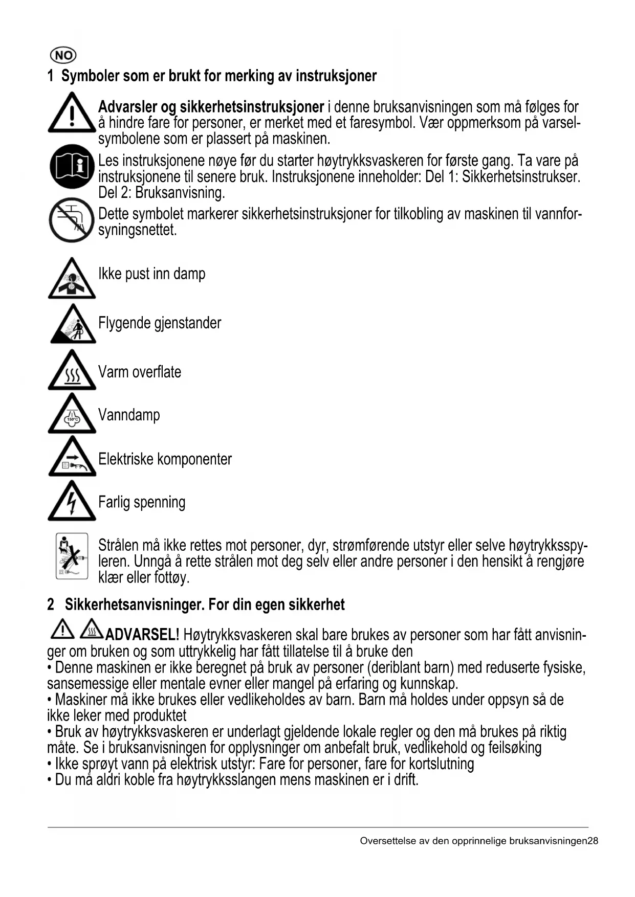 - Se il cavo di alimentazione è danneggiato, deve essere sostituito dal produttore, da un addet- to all’assistenza autorizzato o da una persona con qualifica analoga per evitare rischi.Oversettelse av den opprinnelige bruksanvisningen28 1 Symboler som er brukt for merking av instruksjoner Advarsler og sikkerhetsinstruksjoner i denne bruksanvisningen som må følges for å hindre fare for personer, er merket med et faresymbol. Vær oppmerksom på varsel- symbolene som er plassert på maskinen. Les instruksjonene nøye før du starter høytrykksvaskeren for første gang. Ta vare på instruksjonene til senere bruk. Instruksjonene inneholder: Del 1: Sikkerhetsinstrukser. Del 2: Bruksanvisning. Dette symbolet markerer sikkerhetsinstruksjoner for tilkobling av maskinen til vannfor- syningsnettet. Ikke pust inn damp Flygende gjenstander Varm overflate Vanndamp Elektriske komponenter Farlig spenning Strålen må ikke rettes mot personer, dyr, strømførende utstyr eller selve høytrykksspy- leren. Unngå å rette strålen mot deg selv eller andre personer i den hensikt å rengjøre klær eller fottøy. 2 Sikkerhetsanvisninger. For din egen sikkerhet ADVARSEL! Høytrykksvaskeren skal bare brukes av personer som har fått anvisnin- ger om bruken og som uttrykkelig har fått tillatelse til å bruke den