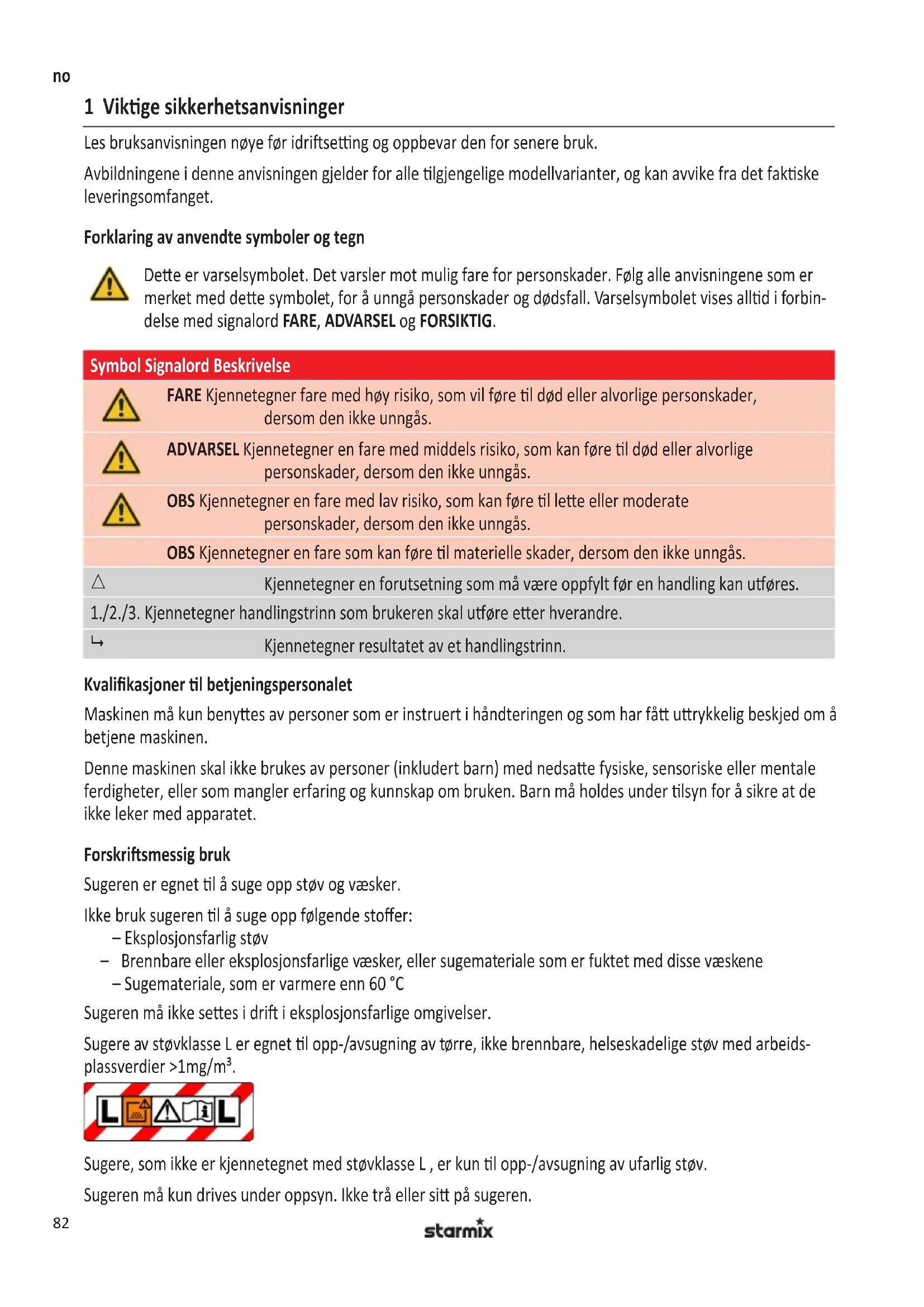 Sugere av støvklasse L er egnet til opp-/avsugning av tørre, ikke brennbare, helseskadelige støv med arbeids- plassverdier >1mg / m^3