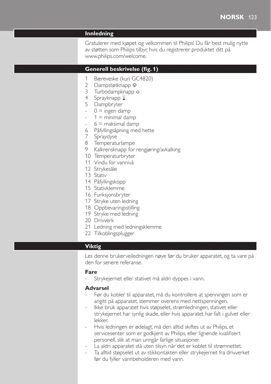 Viktig Les denne brukerveiledningen nøye før du bruker apparatet, og ta vare på den for senere referanse. Fare -- Strykejernet eller stativet må aldri dyppes i vann. Advarsel -- Før du kobler til apparatet, må du kontrollere at spenningen som er angitt på apparatet, stemmer overens med nettspenningen. -- Ikke bruk apparatet hvis støpselet, strømledningen, stativet eller strykejernet har synlig skade, eller hvis apparatet har falt i gulvet eller lekker. -- Hvis ledningen er ødelagt, må den alltid skiftes ut av Philips, et servicesenter som er godkjent av Philips, eller lignende kvalifisert personell, slik at man unngår farlige situasjoner. -- La aldri apparatet stå uten tilsyn når det er koblet til strømnettet. -- Ta alltid støpselet ut av stikkontakten eller strykejernet fra drivverket før du fyller vannbeholderen med vann.