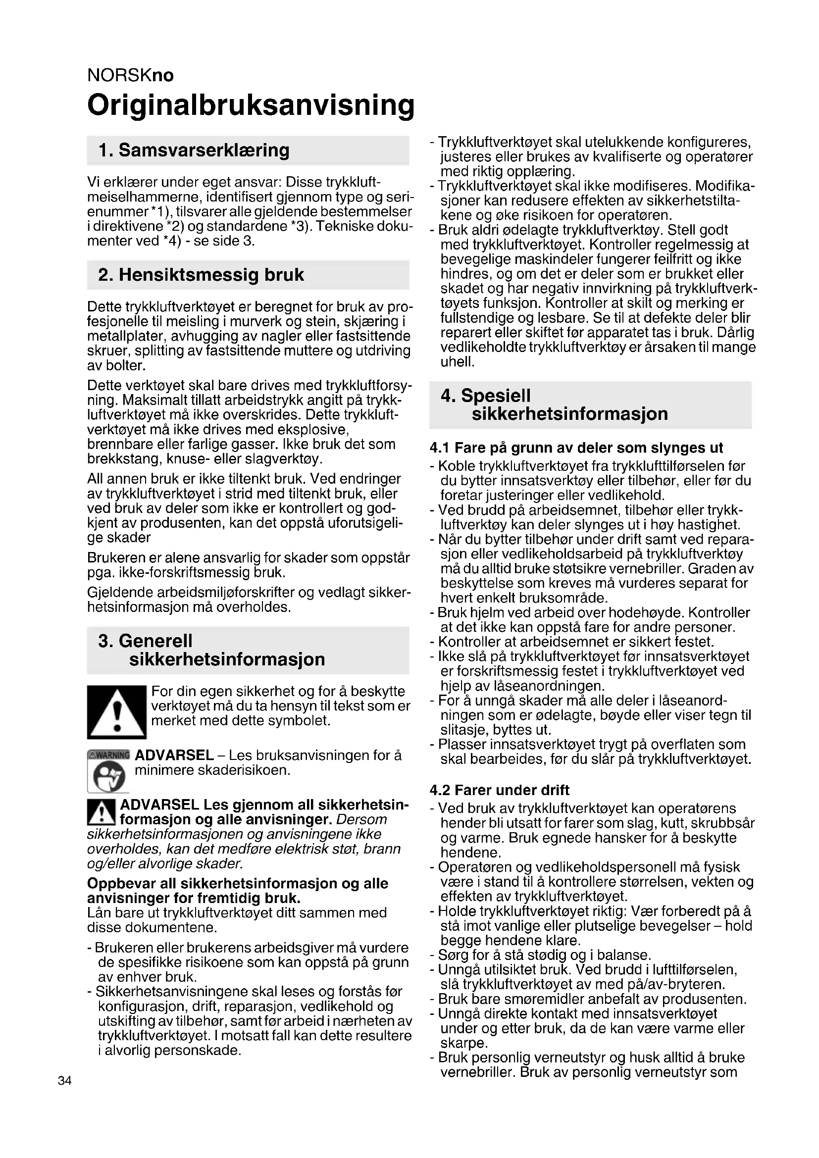 Originalbruksanvisning Vi erklærer under eget ansvar: Disse trykkluft- meiselhammerne, identifisert gjennom type og seri- enummer *1), tilsvarer alle gjeldende bestemmelser i direktivene *2) og standardene *3). Tekniske doku- menter ved *4) - se side 3. Dette trykkluftverktøyet er beregnet for bruk av pro- fesjonelle til meisling i murverk og stein, skjæring i metallplater, avhugging av nagler eller fastsittende skruer, splitting av fastsittende muttere og utdriving av bolter. Dette verktøyet skal bare drives med trykkluftforsy- ning. Maksimalt tillatt arbeidstrykk angitt på trykk- luftverktøyet må ikke overskrides. Dette trykkluft- verktøyet må ikke drives med eksplosive, brennbare eller farlige gasser. Ikke bruk det som brekkstang, knuse- eller slagverktøy. All annen bruk er ikke tiltenkt bruk. Ved endringer av trykkluftverktøyet i strid med tiltenkt bruk, eller ved bruk av deler som ikke er kontrollert og god- kjent av produsenten, kan det oppstå uforutsigeli- ge skader Brukeren er alene ansvarlig for skader som oppstår pga. ikke-forskriftsmessig bruk. Gjeldende arbeidsmiljøforskrifter og vedlagt sikker- hetsinformasjon må overholdes. For din egen sikkerhet og for å beskytte verktøyet må du ta hensyn til tekst som er merket med dette symbolet. ADVARSEL – Les bruksanvisningen for å minimere skaderisikoen. ADVARSEL Les gjennom all sikkerhetsin- formasjon og alle anvisninger. Dersom sikkerhetsinformasjonen og anvisningene ikke overholdes, kan det medføre elektrisk støt, brann og/eller alvorlige skader. Oppbevar all sikkerhetsinformasjon og alle anvisninger for fremtidig bruk. Lån bare ut trykkluftverktøyet ditt sammen med disse dokumentene. - Brukeren eller brukerens arbeidsgiver må vurdere de spesifikke risikoene som kan oppstå på grunn av enhver bruk. - Sikkerhetsanvisningene skal leses og forstås før konfigurasjon, drift, reparasjon, vedlikehold og utskifting av tilbehør, samt før arbeid i nærheten av trykkluftverktøyet. I motsatt fall kan dette resultere i alvorlig personskade. - Trykkluftverktøyet skal utelukkende konfigureres, justeres eller brukes av kvalifiserte og operatører med riktig opplæring. - Trykkluftverktøyet skal ikke modifiseres. Modifika- sjoner kan redusere effekten av sikkerhetstilta- kene og øke risikoen for operatøren. - Bruk aldri ødelagte trykkluftverktøy. Stell godt med trykkluftverktøyet. Kontroller regelmessig at bevegelige maskindeler fungerer feilfritt og ikke hindres, og om det er deler som er brukket eller skadet og har negativ innvirkning på trykkluftverk- tøyets funksjon. Kontroller at skilt og merking er fullstendige og lesbare. Se til at defekte deler blir reparert eller skiftet før apparatet tas i bruk. Dårlig vedlikeholdte trykkluftverktøy er årsaken til mange uhell.