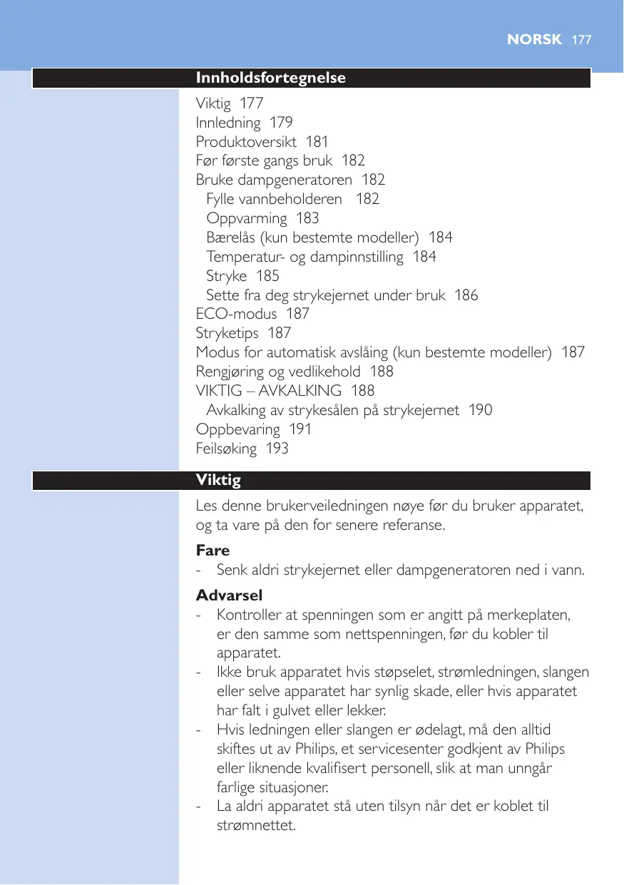 Temps de chauffe 126 Verrouillage du fer (certains modèles uniquement) 127 Température et réglage de la vapeur 128 Repassage 128 Mettre le fer sur son talon pendant le repassage 129 Mode ECO 130 Conseils pour le repassage 130 Mode Arrêt automatique (certains modèles uniquement) 131 Nettoyage et entretien 131 IMPORTANT - DÉTARTRAGE 131 Détartrer la semelle du fer 133 Rangement 135 Dépannage 136 -- N’utilisez pas l’appareil si la fiche, le cordon d’alimentation, le cordon d’arrivée de la vapeur ou l’appareil lui-même est endommagé, s’il est tombé ou s’il fuit. -- Si le cordon d’alimentation ou le cordon d’arrivée de la vapeur est endommagé, il doit être remplacé par Philips, par un Centre Service Agréé Philips ou par une personne qualifiée afin d’éviter tout accident. -- Ne laissez jamais l’appareil sans surveillance pendant qu’il est branché.