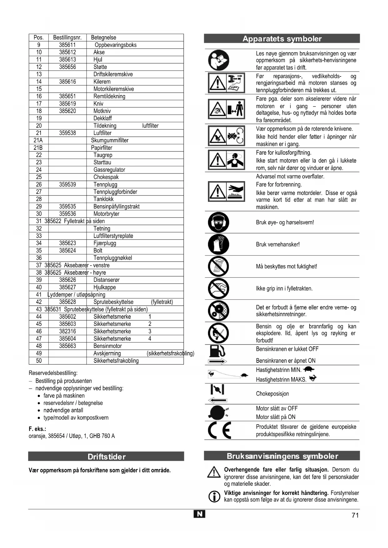 Les nøye gjennom bruksanvisningen og vær oppmerksom på sikkerhets-henvisningene før apparatet tas i drift. Før reparasjons-, vedlikeholds- og rengjøringsarbeid må motoren stanses og tennpluggforbinderen må trekkes ut. Fare pga. deler som akselererer videre når motoren er i gang – personer uten deltagelse, hus- og nyttedyr må holdes borte fra fareområdet. Vær oppmerksom på de roterende knivene. Ikke hold hender eller føtter i åpninger når maskinen er i gang. Fare for kullosforgiftning. Ikke start motoren eller la den gå i lukkete rom, selv når dører og vinduer er åpne. Advarsel mot varme overflater. Fare for forbrenning. Ikke berør varme motordeler. Disse er også varme kort tid etter at man har slått av maskinen. Bruk øye- og hørselsvern! Bruk vernehansker! Må beskyttes mot fuktighet! Ikke grip inn i fylletrakten. Det er forbudt å fjerne eller endre verne- og sikkerhetsinnretninger. Bensin og olje er brannfarlig og kan eksplodere. Ild, åpent lys og røyking er forbudt! Bensinkranen er lukket OFF Bensinkranen er åpnet ON Hastighetstrinn MIN. Hastighetstrinn MAKS.