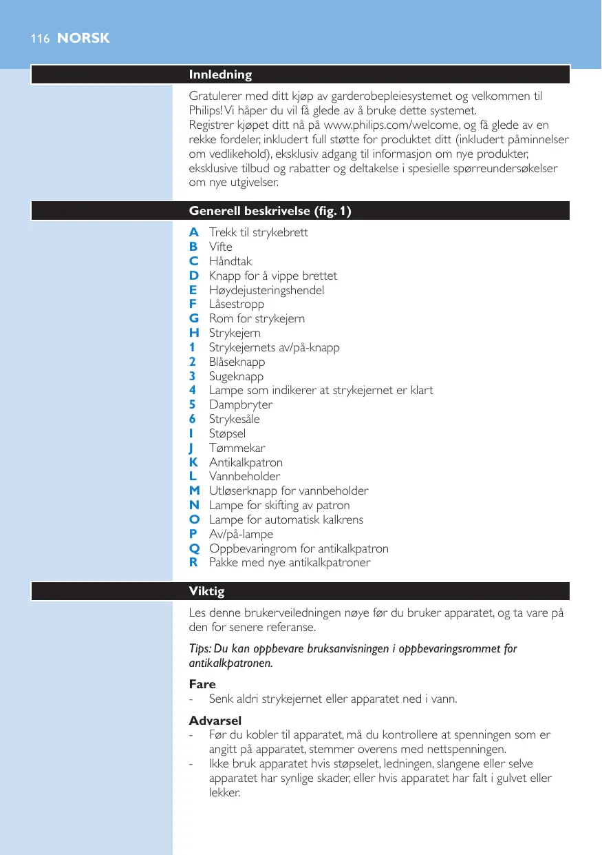 Lisez attentivement ce mode d’emploi avant d’utiliser l’appareil et conservez-le pour un usage ultérieur. Conseil :Vous pouvez loger le mode d’emploi dans le compartiment de rangement des cartouches anticalcaire. Danger -- Ne plongez jamais le fer ni l’appareil dans l’eau. Avertissement -- Avant de brancher l’appareil, vérifiez que la tension indiquée sur l’appareil correspond à la tension supportée par le secteur local. -- N’utilisez pas l’appareil si la fiche, le cordon d’alimentation, le cordon flexible ou l’appareil lui-même sont endommagés, si l’appareil est tombé ou s’il fuit.