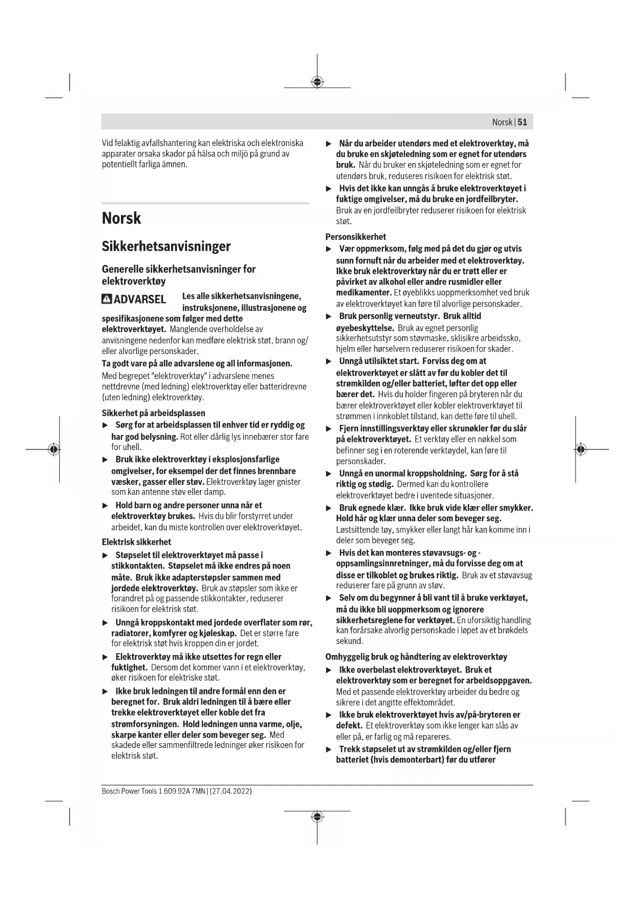 Vibrasjonsnivået og støyemisjonen som er angitt i disse anvisningene er målt i samsvar med en standardisert målemetode og kan brukes til sammenligning av elektroverktøy. Verdiene egner seg også til en foreløpig estimering av vibrasjonsnivået og støyutslippet. Angitt vibrasjonsnivå og støyutslipp representerer de hovedsakelige bruksområdene til elektroverktøyet. Men hvis elektroverktøyet brukes til andre formål, med andre innsatsverktøy eller utilstrekkelig vedlikehold, kan vibrasjonsnivået og støyutslippet avvike fra det som er angitt. Dette kan føre til en betydelig økning av vibrasjonsnivået og støyutslippet for hele arbeidstidsrommet. For en nøyaktig vurdering av vibrasjonsnivået og støyutslippet skal det også tas hensyn til de tidene verktøyet er slått av, eller går, men ikke faktisk er i bruk. Dette kan redusere vibrasjonsnivået og støyutslippet for hele arbeidstidsrommet betraktelig. Bestem ekstra sikkerhetstiltak til beskyttelse av brukeren mot vibrasjonenes virkning, som for eksempel: Vedlikehold av elektroverktøy og innsatsverktøy, holde hendene varme, organisere arbeidsforløpene. Montering Feste ekstrahåndtaket (sebildeA) Skru ut skruen(4) på ekstrahåndtaket(3) helt til ekstrahåndtaket passer i festet(5). Skyv ekstrahåndtaket(3) inn i festet(5). Skru ekstrahåndtaket fast med urviseren. Bruk Igangsetting u Ta hensyn til strømspenningen! Spenningen til strømkilden må stemme overens med angivelsene på elektroverktøyets typeskilt. Elektroverktøy som er merket med 230V kan også brukes med 220V. Bosch Power Tools 1 609 92A 7MN | (27.04.2022)54 | Norsk Inn-/utkobling For å slå på elektroverktøyet skyver du på-/av-bryteren(1) forover, slik at I vises på bryteren. For å slå av elektroverktøyet skyver du på-/av-bryteren(1) bakover, slik at 0 vises på bryteren. Arbeidshenvisninger u Før alle arbeider på elektroverktøyet utføres må støpselet trekkes ut av stikkontakten. u Ta alltid batteriet ut av elektroverktøyet før arbeider på elektroverktøyet utføres (f.eks. vedlikehold, verktøyskifte osv.) og før transport og oppbevaring. Det er fare for skader hvis du trykker på av/på-bryteren ved en feiltagelse. u Elektroverktøyet er ikke egnet for stasjonær bruk. Det må for eksempel ikke spennes fast i en skrustikke eller festes på en arbeidsbenk. u Bruk vernehansker under arbeidet. Pass på at du ikke bøyer skårede platedeler i retning kroppen. Det oppstår skarpe kanter på de skårede platene, som du kan skade deg på. Trykk eventuelt platedeler som bøyer seg, bort fra kroppen eller strømkabelen. Bruk hansker. u Bruk vernehansker under arbeidet, og vær spesielt oppmerksom på strømkabelen. Pass på at du ikke bøyer skårede platedeler i retning kroppen eller strømkabelen. Det oppstår skarpe kanter på de skårede platene, som du kan skade deg eller strømkabelen på. Trykk eventuelt platedelene som bøyer seg, bort fra kroppen eller strømkabelen. Bruk hansker. Elektroverktøyet må kun føres inn mot arbeidsstykket i innkoblet tilstand. Hold elektroverktøyet i en vinkel på 15° mot platen, og pass på at det ikke står skrått mot siden. Før elektroverktøyet jevnt med lett trykk forover i sageretningen. Hvis du trykker det for hardt forover, reduseres levetiden til innsatsverktøyet betraktelig, og elektroverktøyet kan skades. Ved skjæring av kurver må du passe spesielt på at elektroverktøyet ikke kiles fast på siden og du må kun arbeide med svak fremskyvning. Max. platetykkelse som skal skjæres Den maksimale platetykkelsen d max som kan skjæres avhenger av fastheten på materialet som skal bearbeides. Med elektroverktøyet kan det skjæres plater opp til følgende tykkelse: Materiale Maks. fasthet (N/mm