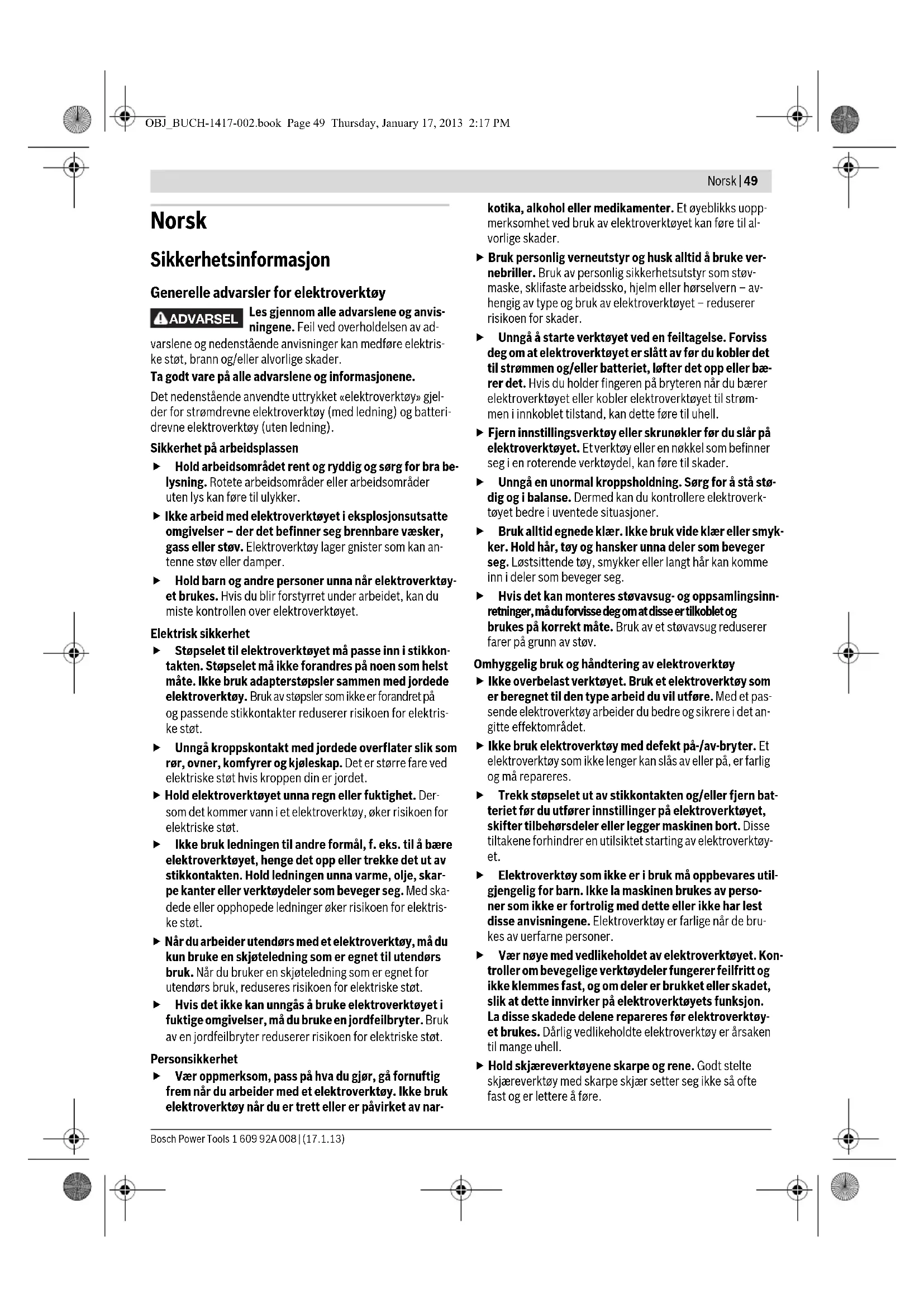 Ved gal bruk kan det lekke væske ut av batteriet. Unngå kontakt med denne væsken. Ved tilfeldig kontakt må det skylles med vann. Hvis det kommer væske i øynene, må du i tillegg oppsøke en lege. Batterivæske som renner ut kan føre til irritasjoner på huden eller forbrenninger. Service Elektroverktøyet ditt skal alltid kun repareres av kvali- fisert fagpersonale og kun med originale reservedeler. Slik opprettholdes verktøyets sikkerhet. Sikkerhetsinformasjonen for batteri-universal- kutter Ikke bearbeid asbestholdig material. Asbest kan frem- kalle kreft. Pass på spenningsførende ledninger ved kutting. Det er fare for skader. Hold aldri hånden foran kniven ved kutting. Det er fare for skader. Unngå en uvilkårlig innkopling. Hvis du bærer et elektro- verktøy med fingeren på på-/av-bryteren kan det oppstå uhell. Batteriet må ikke åpnes. Det er fare for kortslutning. Beskytt batteriet mot varme, f. eks. også mot per- manent solinnvirkning, ild, vann og fuktighet. Det er fare for eksplosjoner. Ved skader og usakkyndig bruk av batteriet kan det slippe ut damp. Tilfør frisk luft og gå til lege hvis det oppstår helseproblemer. Dampene kan irritere ånde- drettsorganene. Bruk batteriet kun i kombinasjon med Bosch el-verk- tøyet. Kun slik beskyttes batteriet mot farlig overbelast- ning. Bruk kun originale Bosch batterier med en spenning som er angitt på typeskiltet til elektroverktøyet ditt. Ved bruk av andre batterier, f. eks. etterligninger, resirku- lerte batterier eller batterier fra andre produsenter, er det fare for fysiske og materialle skader hvis batteriene eksplo- derer. Produkt- og ytelsesbeskrivelse Les gjennom alle advarslene og anvisninge- ne. Feil ved overholdelsen av advarslene og nedenstående anvisninger kan medføre elek- triske støt, brann og/eller alvorlige skader. Brett ut utbrettssiden med bildet av maskinen, og la denne si- den være utbrettet mens du leser bruksanvisningen. Formålsmessig bruk Elektroverktøyet er beregnet til kutting av fleksible, myke ma- terialer opp til en tykkelse på 11 mm, som tepper, PVC, kar- tong, lærkanter, stoffer og lignende materialer. Det er egnet til rette og buede snitt. Illustrerte komponenter Nummereringen av de illustrerte komponentene gjelder for bildet av elektroverktøyet på illustrasjonssidene. 1 Riflet skrue 2 Skjærelinjemarkering «Cut Control» 3 Justerbar beskyttelsesplate (2 –11 mm) 4 På-/av-bryter 5 Håndtak (isolert grepflate) 6 Batteri 7 Batteri-låsetast 8 Tast for ladetilstandsindikator 9 Batteri-ladeindikator 10 Kniv 11 Skrue til festing av kniven 12 Føringsskinne Illustrert eller beskrevet tilbehør inngår ikke i standard-leveran- sen. Det komplette tilbehøret finner du i vårt tilbehørsprogram. Tekniske data Støy-/vibrasjonsinformasjon Måleverdier for lyden funnet i henhold til EN 60745. Det typiske A-bedømte lydtrykknivået for elektroverktøyet er mindre enn 70 dB(A). Usikkerhet K =3 dB. Støynivået kan i løpet av arbeidet overskride 80 dB(A). Bruk hørselvern! Totale svingningsverdier a