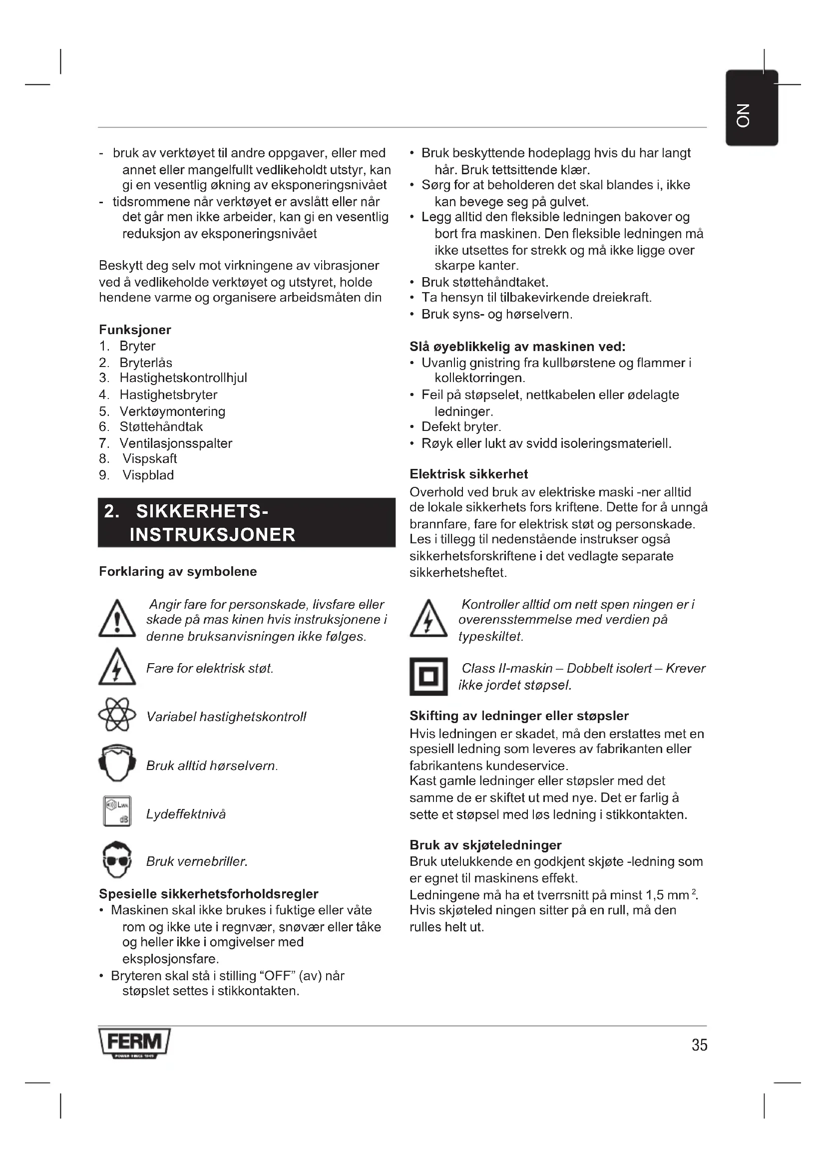 INSTRUKSJONER Forklaring av symbolene Angir fare for personskade, livsfare eller skade på mas kinen hvis instruksjonene i denne bruksanvisningen ikke følges. Fare for elektrisk støt. Variabel hastighetskontroll Bruk alltid hørselvern. Lydeffektnivå Bruk vernebriller. Spesielle sikkerhetsforholdsregler