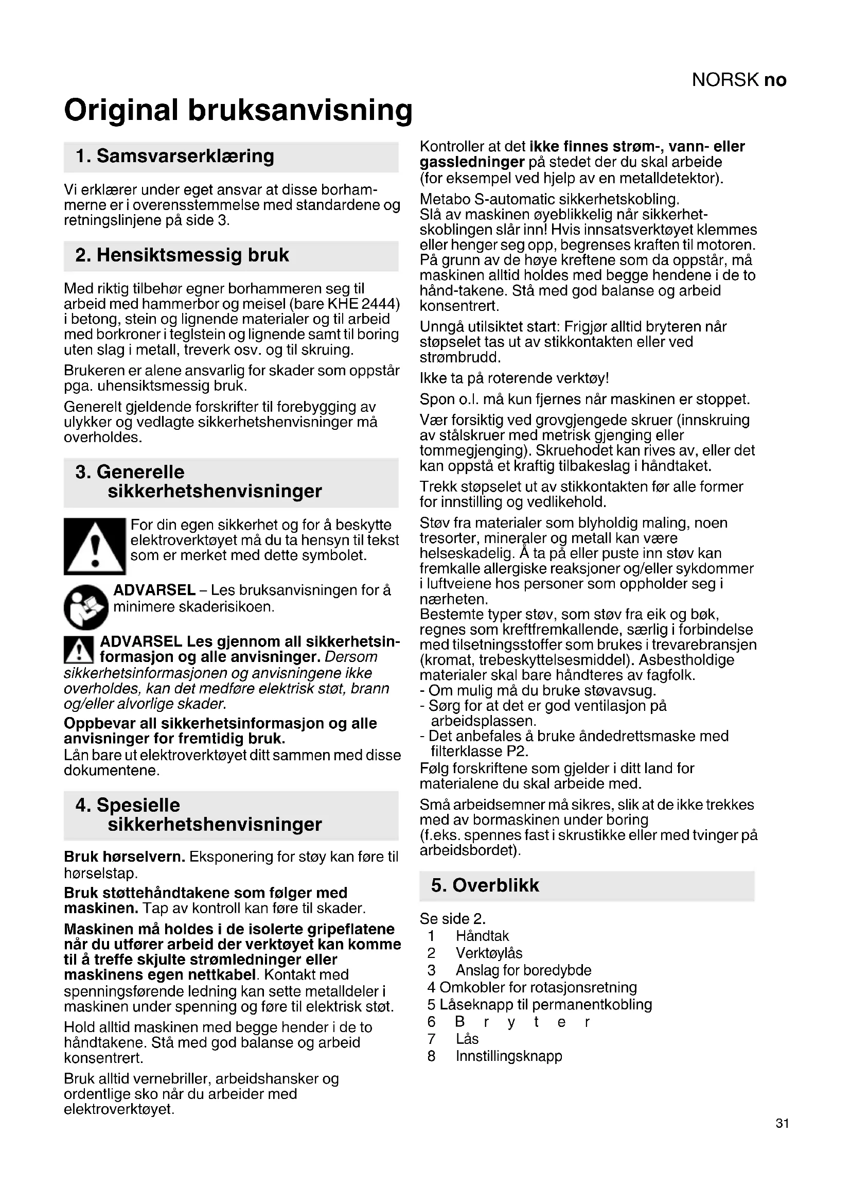 Original bruksanvisning Vi erklærer under eget ansvar at disse borham- merne er i overensstemmelse med standardene og retningslinjene på side 3. Med riktig tilbehør egner borhammeren seg til arbeid med hammerbor og meisel (bare KHE 2444) i betong, stein og lignende materialer og til arbeid med borkroner i teglstein og lignende samt til boring uten slag i metall, treverk osv. og til skruing. Brukeren er alene ansvarlig for skader som oppstår pga. uhensiktsmessig bruk. Generelt gjeldende forskrifter til forebygging av ulykker og vedlagte sikkerhetshenvisninger må overholdes. For din egen sikkerhet og for å beskytte elektroverktøyet må du ta hensyn til tekst som er merket med dette symbolet. ADVARSEL – Les bruksanvisningen for å minimere skaderisikoen. ADVARSEL Les gjennom all sikkerhetsin- formasjon og alle anvisninger. Dersom sikkerhetsinformasjonen og anvisningene ikke overholdes, kan det medføre elektrisk støt, brann og/eller alvorlige skader. Oppbevar all sikkerhetsinformasjon og alle anvisninger for fremtidig bruk. Lån bare ut elektroverktøyet ditt sammen med disse dokumentene. Bruk hørselvern. Eksponering for støy kan føre til hørselstap. Bruk støttehåndtakene som følger med maskinen. Tap av kontroll kan føre til skader. Maskinen må holdes i de isolerte gripeflatene når du utfører arbeid der verktøyet kan komme til å treffe skjulte strømledninger eller maskinens egen nettkabel. Kontakt med spenningsførende ledning kan sette metalldeler i maskinen under spenning og føre til elektrisk støt. Hold alltid maskinen med begge hender i de to håndtakene. Stå med god balanse og arbeid konsentrert. Bruk alltid vernebriller, arbeidshansker og ordentlige sko når du arbeider med elektroverktøyet. Kontroller at det ikke finnes strøm-, vann- eller gassledninger på stedet der du skal arbeide (for eksempel ved hjelp av en metalldetektor). Metabo S-automatic sikkerhetskobling. Slå av maskinen øyeblikkelig når sikkerhet- skoblingen slår inn! Hvis innsatsverktøyet klemmes eller henger seg opp, begrenses kraften til motoren. På grunn av de høye kreftene som da oppstår, må maskinen alltid holdes med begge hendene i de to hånd-takene. Stå med god balanse og arbeid konsentrert. Unngå utilsiktet start: Frigjør alltid bryteren når støpselet tas ut av stikkontakten eller ved strømbrudd. Ikke ta på roterende verktøy! Spon o.l. må kun fjernes når maskinen er stoppet. Vær forsiktig ved grovgjengede skruer (innskruing av stålskruer med metrisk gjenging eller tommegjenging). Skruehodet kan rives av, eller det kan oppstå et kraftig tilbakeslag i håndtaket. Trekk støpselet ut av stikkontakten før alle former for innstilling og vedlikehold. Støv fra materialer som blyholdig maling, noen tresorter, mineraler og metall kan være helseskadelig. Å ta på eller puste inn støv kan fremkalle allergiske reaksjoner og/eller sykdommer i luftveiene hos personer som oppholder seg i nærheten. Bestemte typer støv, som støv fra eik og bøk, regnes som kreftfremkallende, særlig i forbindelse med tilsetningsstoffer som brukes i trevarebransjen (kromat, trebeskyttelsesmiddel). Asbestholdige materialer skal bare håndteres av fagfolk. - Om mulig må du bruke støvavsug. - Sørg for at det er god ventilasjon på arbeidsplassen. - Det anbefales å bruke åndedrettsmaske med filterklasse P2. Følg forskriftene som gjelder i ditt land for materialene du skal arbeide med. Små arbeidsemner må sikres, slik at de ikke trekkes med av bormaskinen under boring (f.eks. spennes fast i skrustikke eller med tvinger på arbeidsbordet). Se side 2.