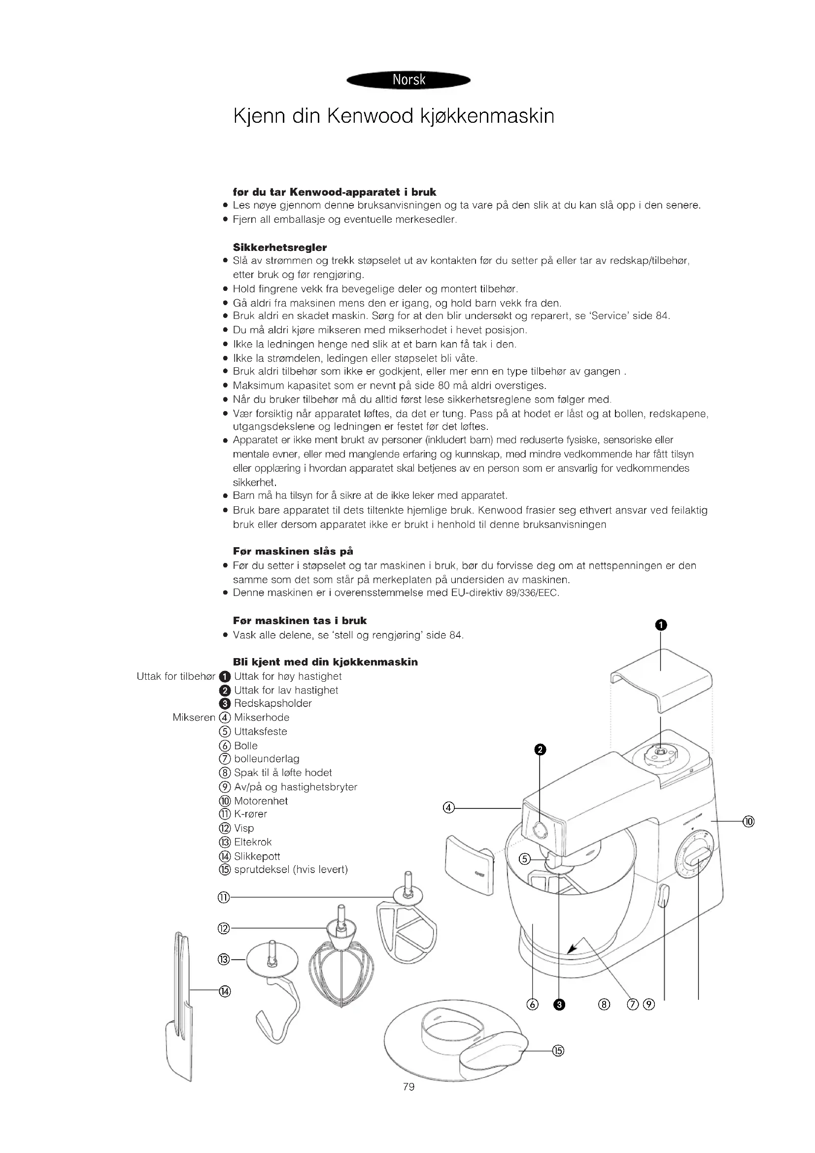 Bruk bare apparatet til dets tiltenkte hjemlige bruk. Kenwood frasier seg ethvert ansvar ved feilaktig bruk eller dersom apparatet ikke er brukt i henhold til denne bruksanvisningen Før maskinen slås på